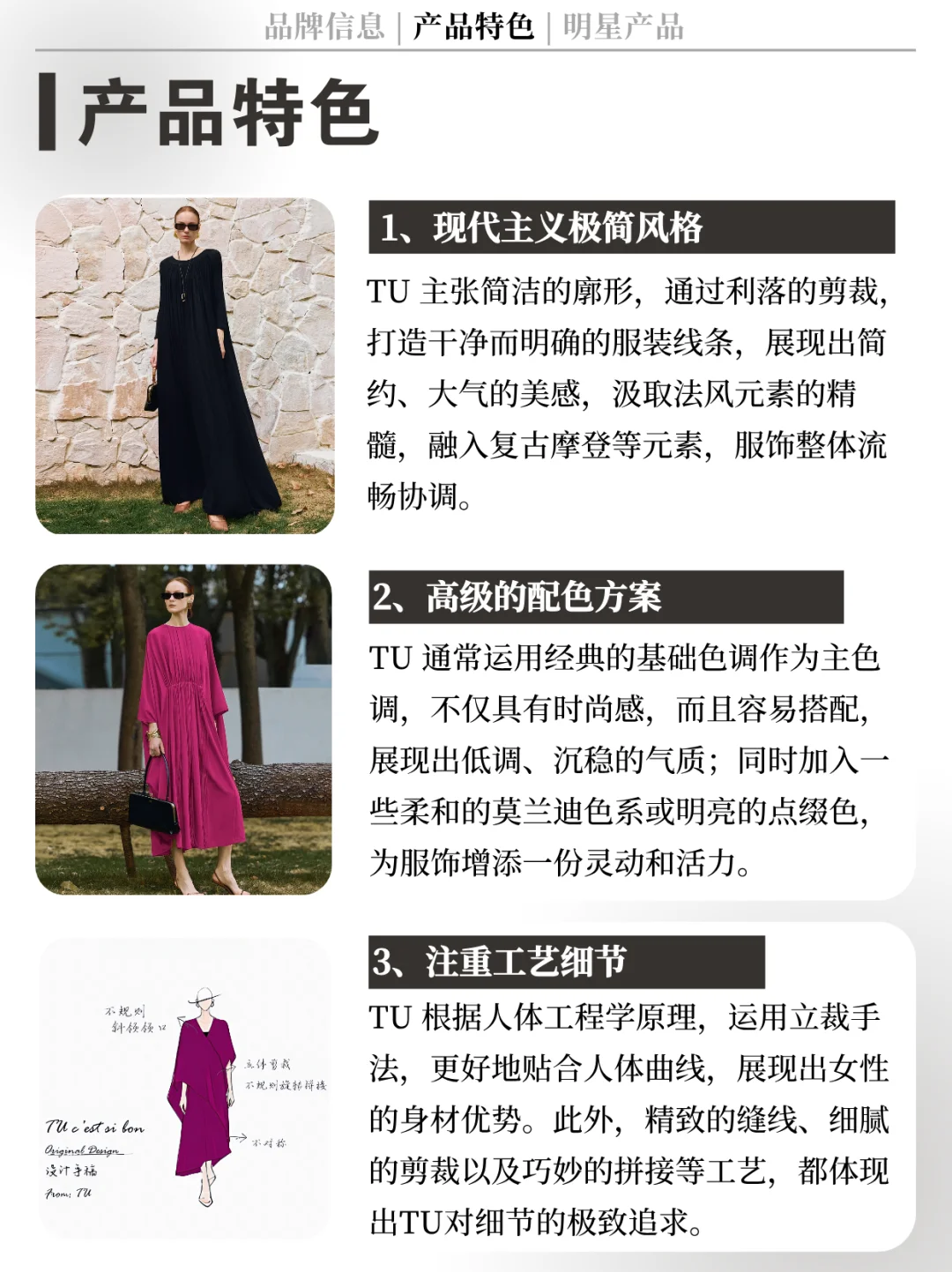 [向右R] 总的来说,TU女装以其独特的设计风格、高品质的面料选择和精致的设计特色,在市场上建立了鲜明的品牌形象。吸引了众多追求个性、品质和时尚的都市女性消费者。