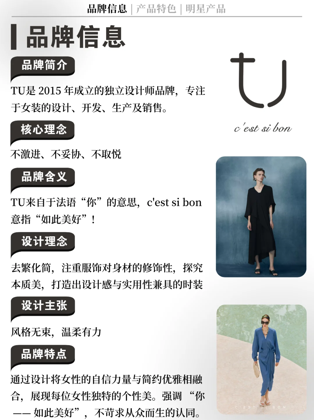 👉 品牌简介:TU是 2015 年成立的独立设计师品牌,专注于女装的设计、开发、生产及销售。