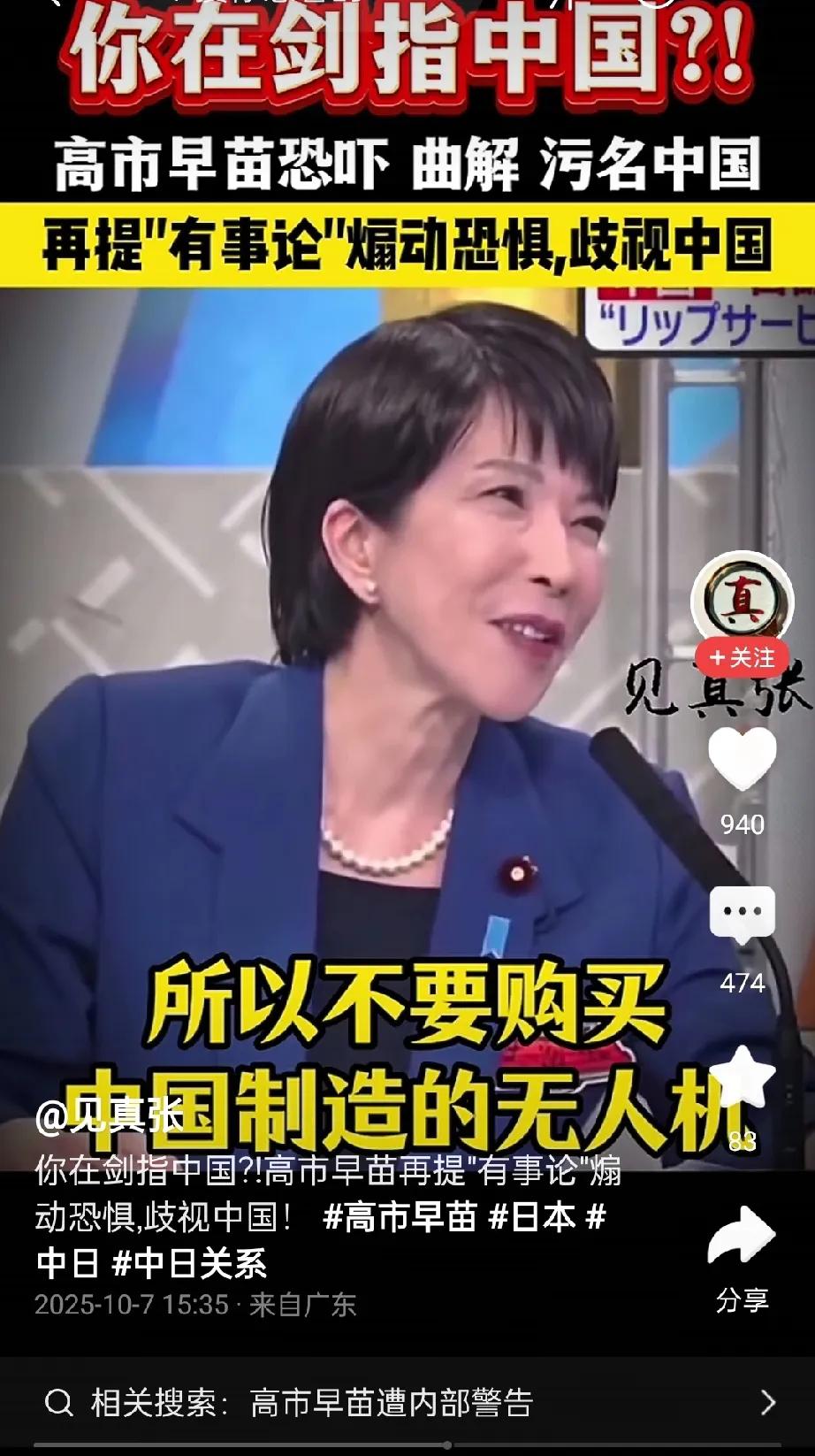 高市早苗在一期视频里表示,不要购买中国制造的无人机要防止在日本的中国人和企业,还有阿里巴巴和腾讯,防止遇到时事的时候,会成为情报中心。 这个说法从另一个方面也说明了,高市早苗是防着中国人的。哪怕你在日本有地,有房,也防着你! 这对汉奸石平之流来说,简直就是打脸!还有想抱高市早苗大腿的有些人,听听高市早苗的这番话吧!就算你忠心耿耿,人家也不稀罕!石平之流汉奸们,寒心吧? 看看高市早苗这嘴脸,掩盖不住内心的“倭”龊!