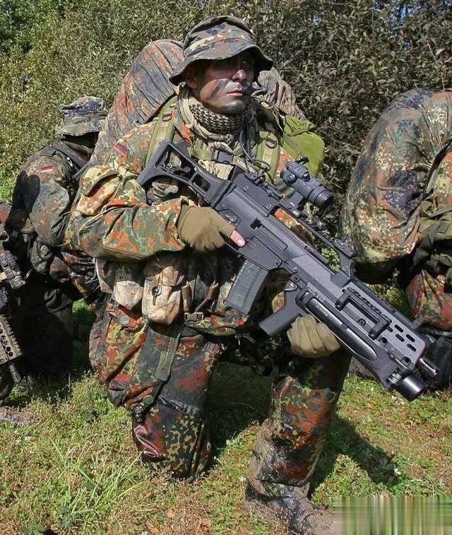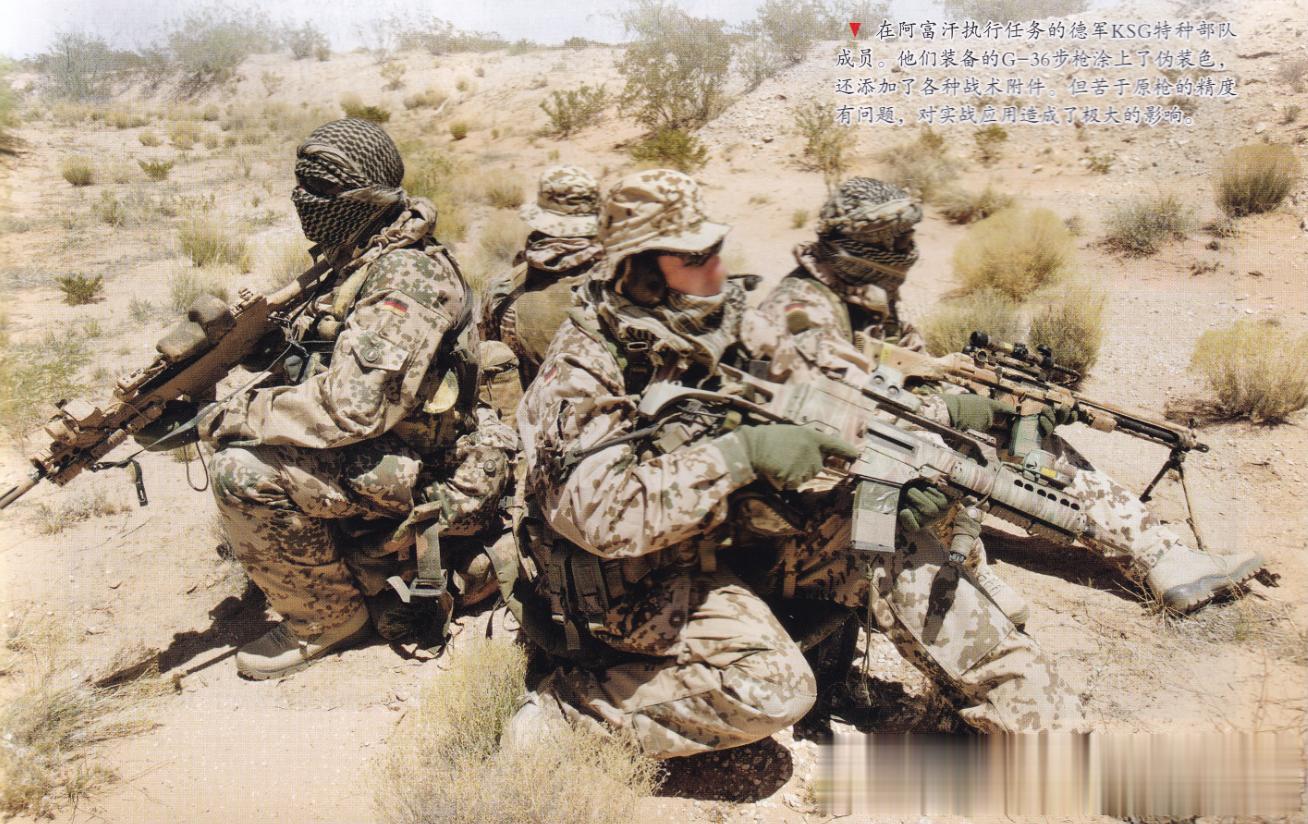 图示:在阿富汗执行任务的德军KSG特种部队成员。他们装备的G-36步枪涂上了伪装色,还添加了各种战术附件。但苦于原枪的精度有问题,对实战应用造成了极大的影响。