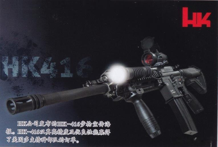 HK公司发布的HK-416步枪宣传海报。HK-416以其高精度及优良性能赢得了美国多支特种部队的订单。
