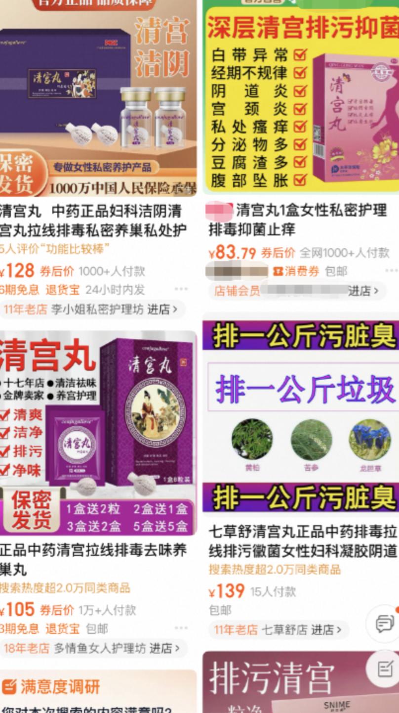 多款“清宫丸”同类产品在平台销售,主打“排污”“清宫”“抑菌”等功效,有的还暗示可应对多种炎症。平台截图