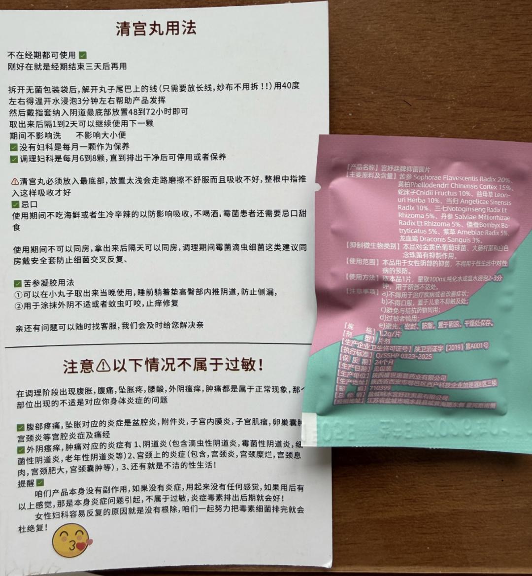这张附赠的卡片上称:“在调理阶段出现腹胀,腹痛,坠胀疼,腰酸,外阴瘙痒,肿痛都是属于正常现象,哪个部位出现的不适是对应你身体炎症的问题。例如,腹部疼痛、坠胀,对应的炎症是盆腔炎、附件炎、子宫内膜炎、子宫肌瘤、卵巢囊肿、宫颈炎等宫腔炎症及痛经;外阴瘙痒、肿痛,对应的炎症有阴道炎(包含滴虫性阴道炎、霉菌性阴道炎、细菌性阴道炎、老年性阴道炎等),宫颈上的炎症(包含宫颈炎,宫颈糜烂,宫颈息肉,宫颈肥大,宫颈囊肿等),还有就是不洁的性生活。”