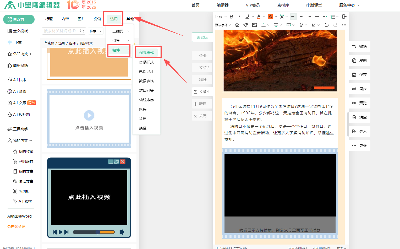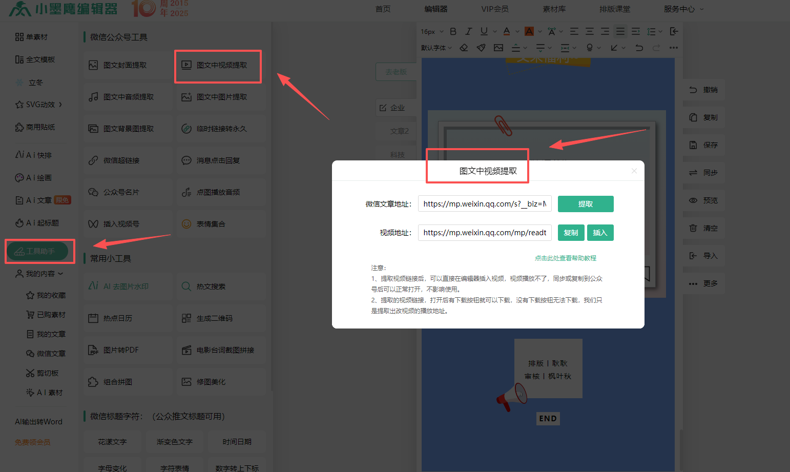 第三步:获取视频链接(关键步骤)回到首页进入草稿箱,打开含视频的图文,复制浏览器地址栏的链接。接着在小墨鹰编辑器的"工具助手"里找到"图文中视频提取"功能,粘贴链接后点击提取,就能获得纯净的视频直链。最后一步:在排版中使用视频你可以在单素材区选择喜欢的视频播放器样式,粘贴刚才提取的链接;或者直接在编辑区插入视频组件。完成排版后,通过复制或同步功能将内容推送到公众号。