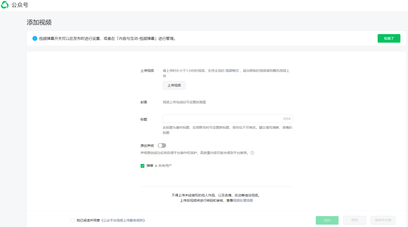 第一步:上传视频到公众号后台登录公众号后台,在左侧菜单找到"素材库",点击"视频"选项,然后选择"添加"。上传时记得选个醒目的封面图,这是吸引点击的关键。勾选同意服务条款后点击保存,系统会提示"审核中,预计1小时内"。不过根据我的经验,通常3-5分钟就能通过,比提示的快很多。