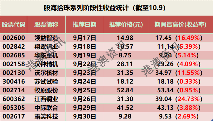 附表:往期股海拾珠系列阶段性收益统计一览(截至10.9)