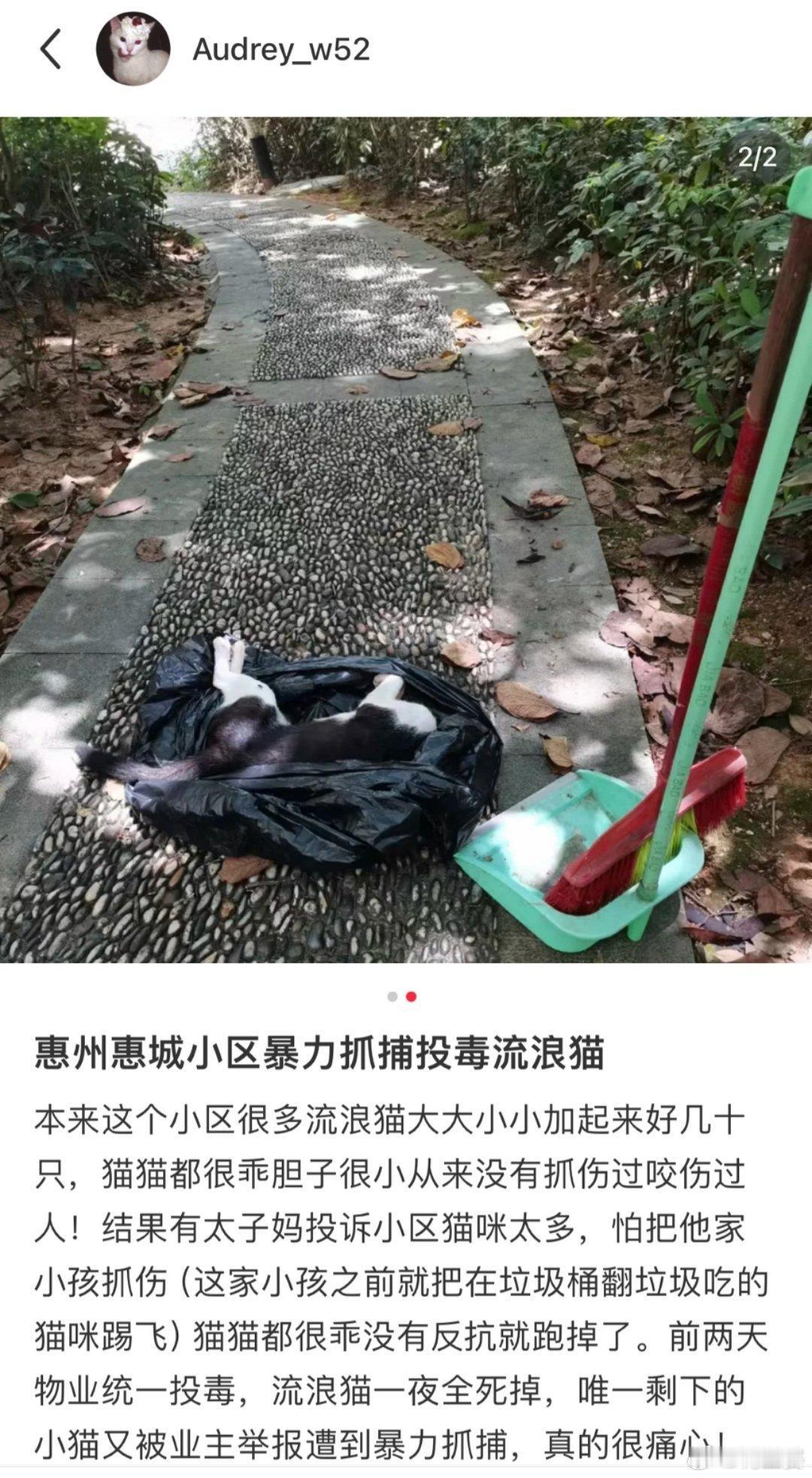 网友投稿—— “惠州某小区暴力抓捕投毒流浪猫” 什么情况!!明明有更好更文明的解决方式,为什么要这么暴力残忍??? 惠州惠城小区暴力抓捕投毒流浪猫 本来这个小区很多流浪猫大大小小加起来好几十只,猫猫都很乖胆子很小从来没有抓伤过咬伤过人!结果有太子妈投诉小区猫咪太多,怕把他家小孩抓伤(这家小孩之前就把在垃圾桶翻垃圾吃的猫咪踢飞)猫猫都很乖没有反抗就跑掉了。前两天物业统一投毒,流浪猫一夜全死掉,唯一剩下的 小猫又被业主举报遭到暴力抓捕,真的很痛心投诉举报电话0752——12345