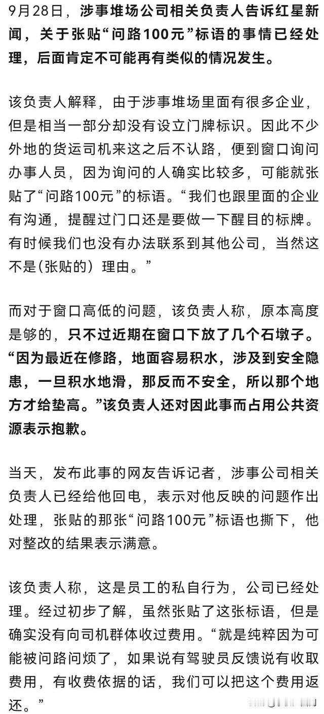 司机称在上海办事遇“丁义珍式”窗口,还张贴“问路100元”标语,涉事公司:已处理,后续不会发生类似情况 近日,一名货运司机在某短视频平台分享了上海市铁山路28号的海行堆场办事窗口照片,显示该窗口不仅是“丁义珍式”窗口,办手续的司机要蹲下,而且还张贴了一张“问路100元”的标语。