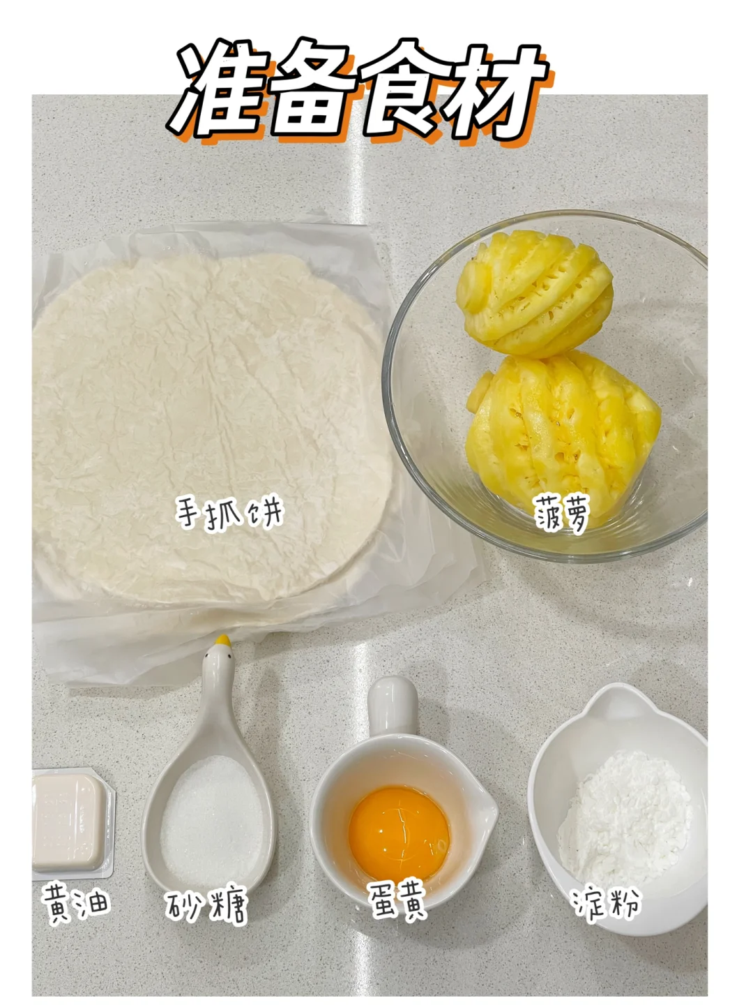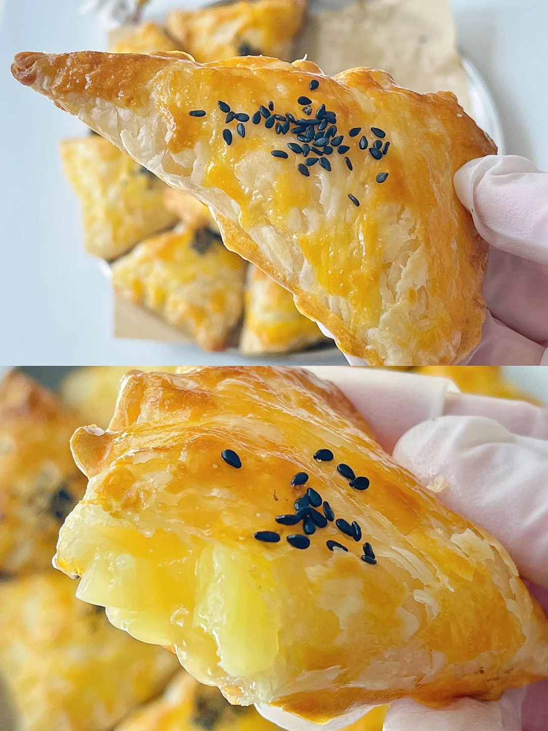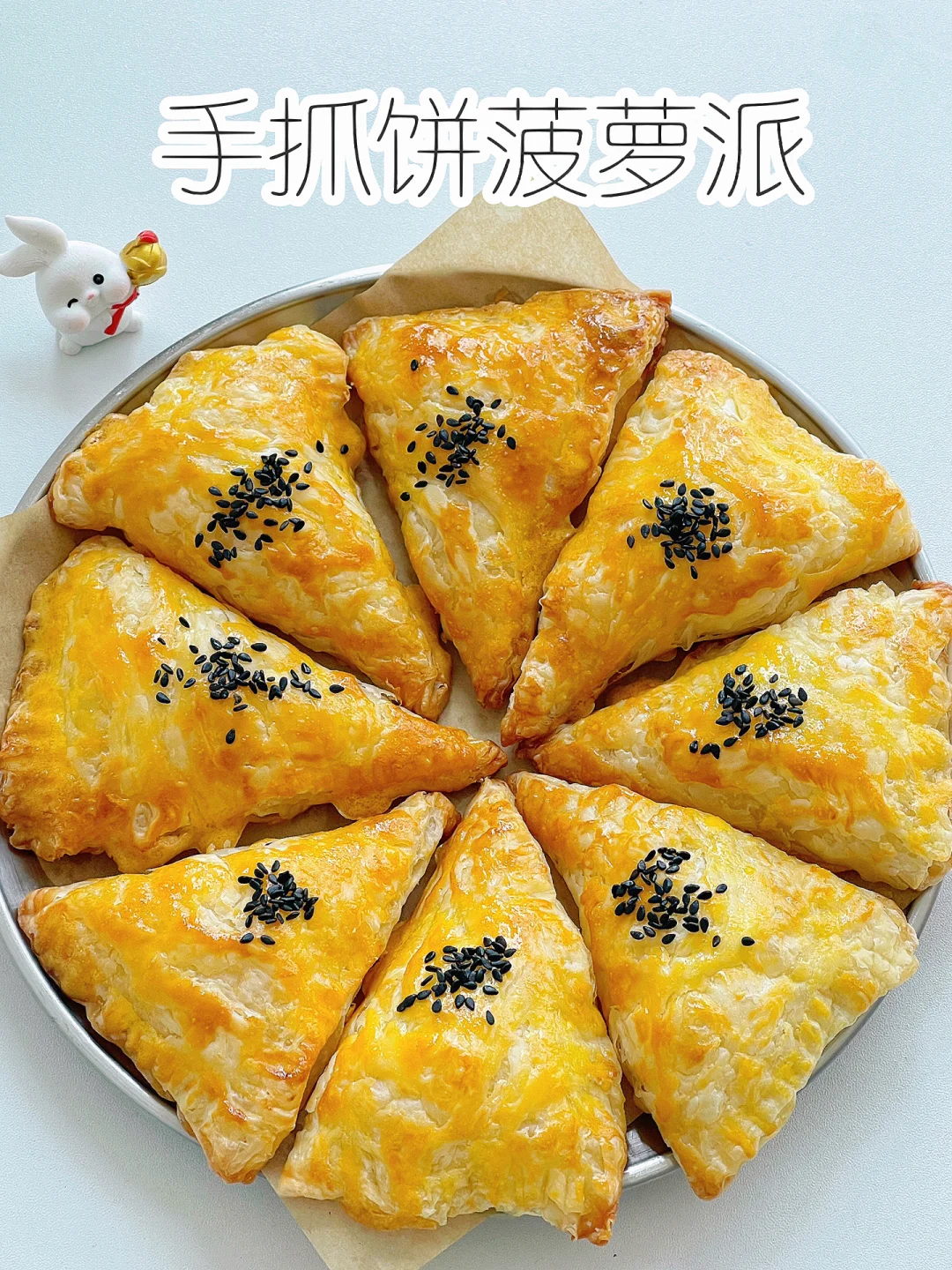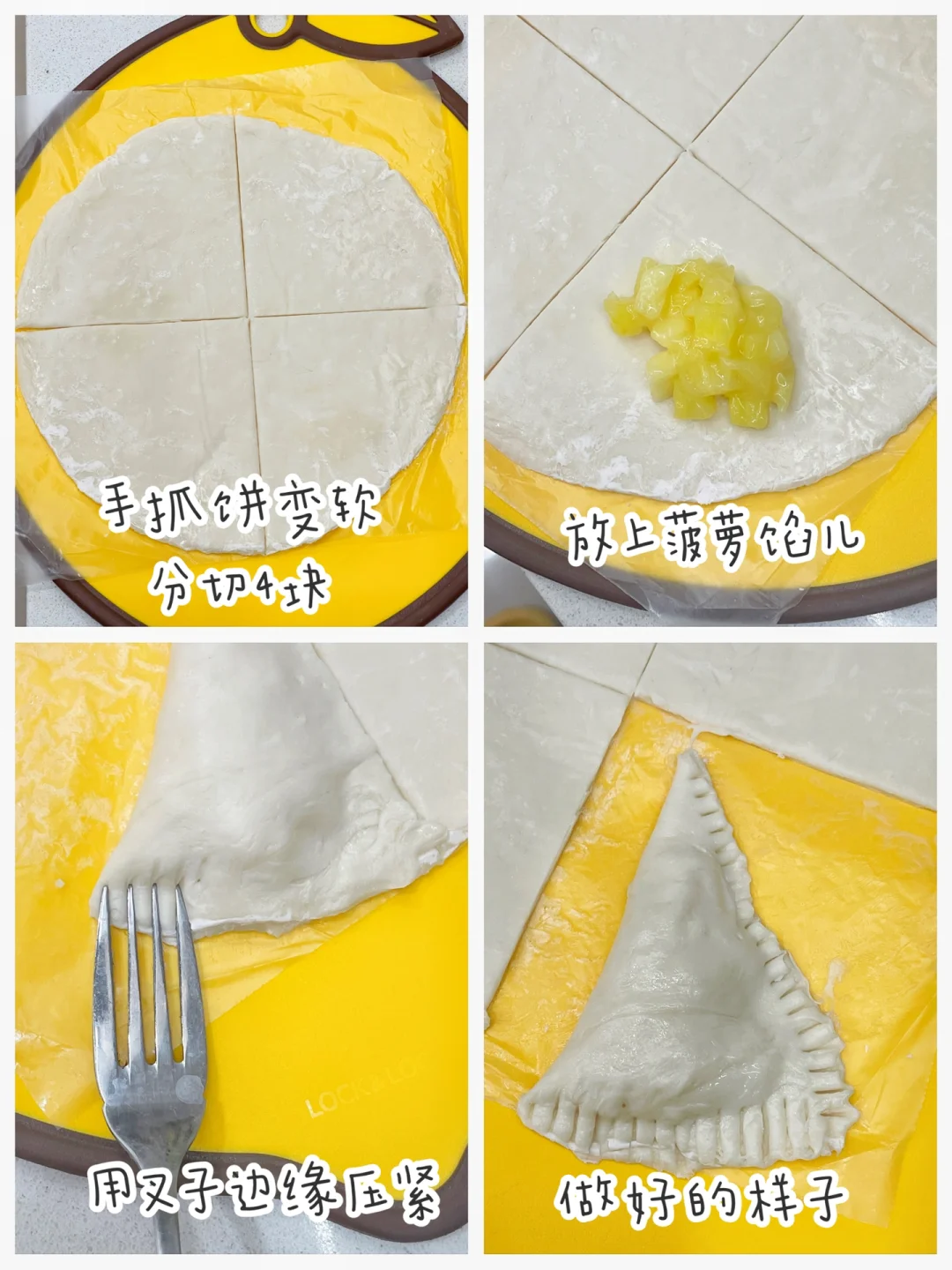 又到了吃菠萝的最佳季节,今天用手抓饼和菠萝搭配做了一款巨好吃的菠萝派,口感酥脆酸甜,做完全家人秒光盘,后悔做少了[偷笑R] ✅准备食材:菠萝、手抓饼、黄油、砂糖、蛋黄、淀粉 ✅制作方法: 🔹菠萝切小块。 🔹锅中放入黄油待融化,放入菠萝丁翻炒变软,再放入2勺糖继续翻炒变软, 🔹放入水淀粉,翻炒至粘稠盛出放凉备用。 🔹手抓饼解冻变软,分成4小块,每块中间放入菠萝馅儿料,用叉子把边缘压紧。 🔹烤箱提前预热,上下管190度20分钟。