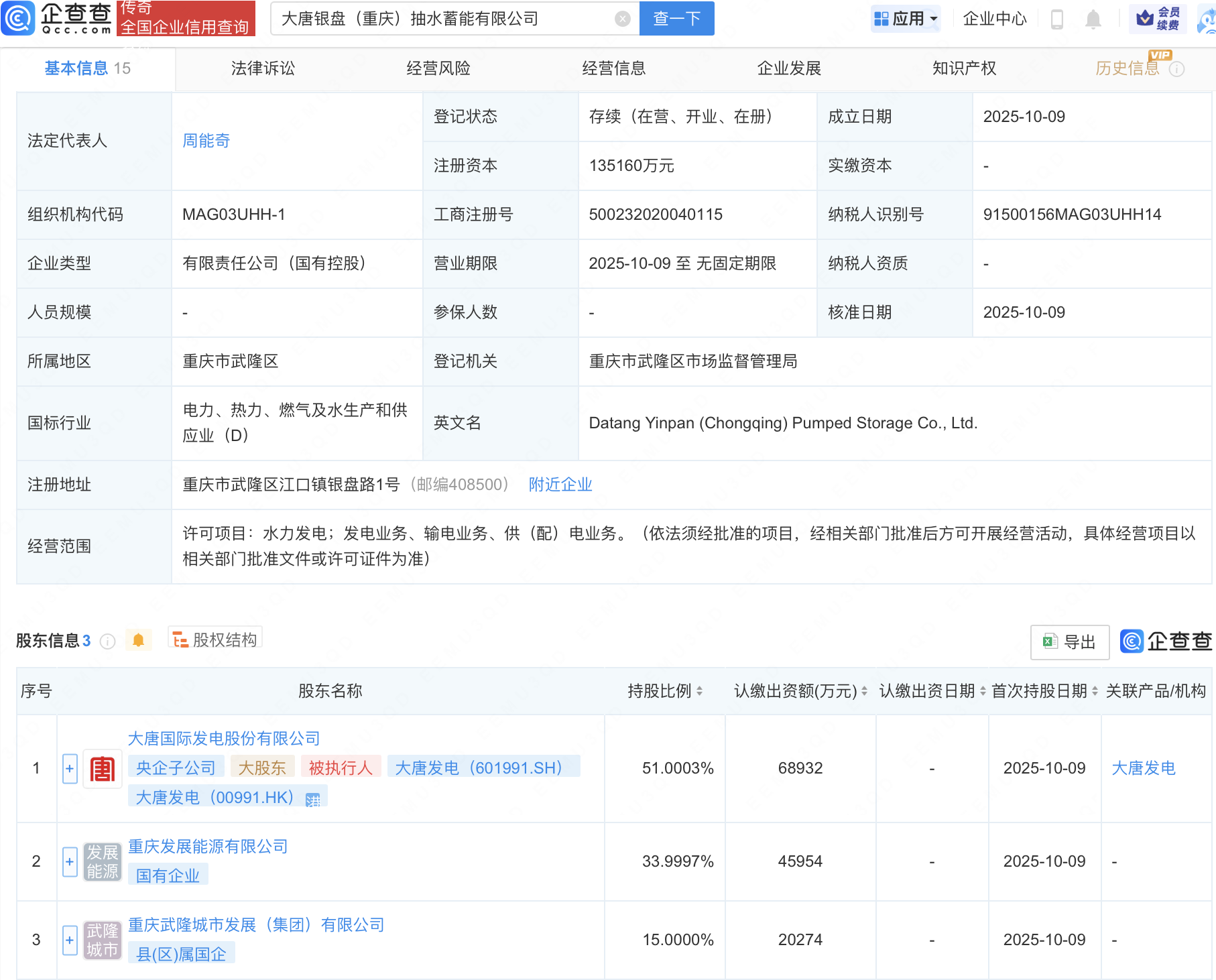 企查查APP显示,近日,大唐银盘(重庆)抽水蓄能有限公司成立,注册资本约13.52亿元,经营范围包含:水力发电;发电业务、输电业务、供(配)电业务。企查查股权穿透显示,该公司由大唐发电(601991)等共同持股。