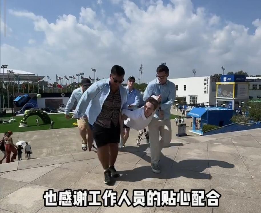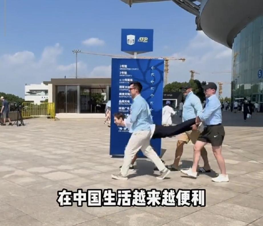 奇葩了!上海网球赛场又抬走一个,这回抬的可是一个真正的外籍人士,怎么回事呢? 原来是一个创意的恶搞,一外国帅哥自称上海网球赛场新增了特色服务,因为天气炎热,他就懒得走路,让工作人员抬进去又抬出来,不得不说,外国人的心态可真好[大笑],是否值得我们国人学习呢?