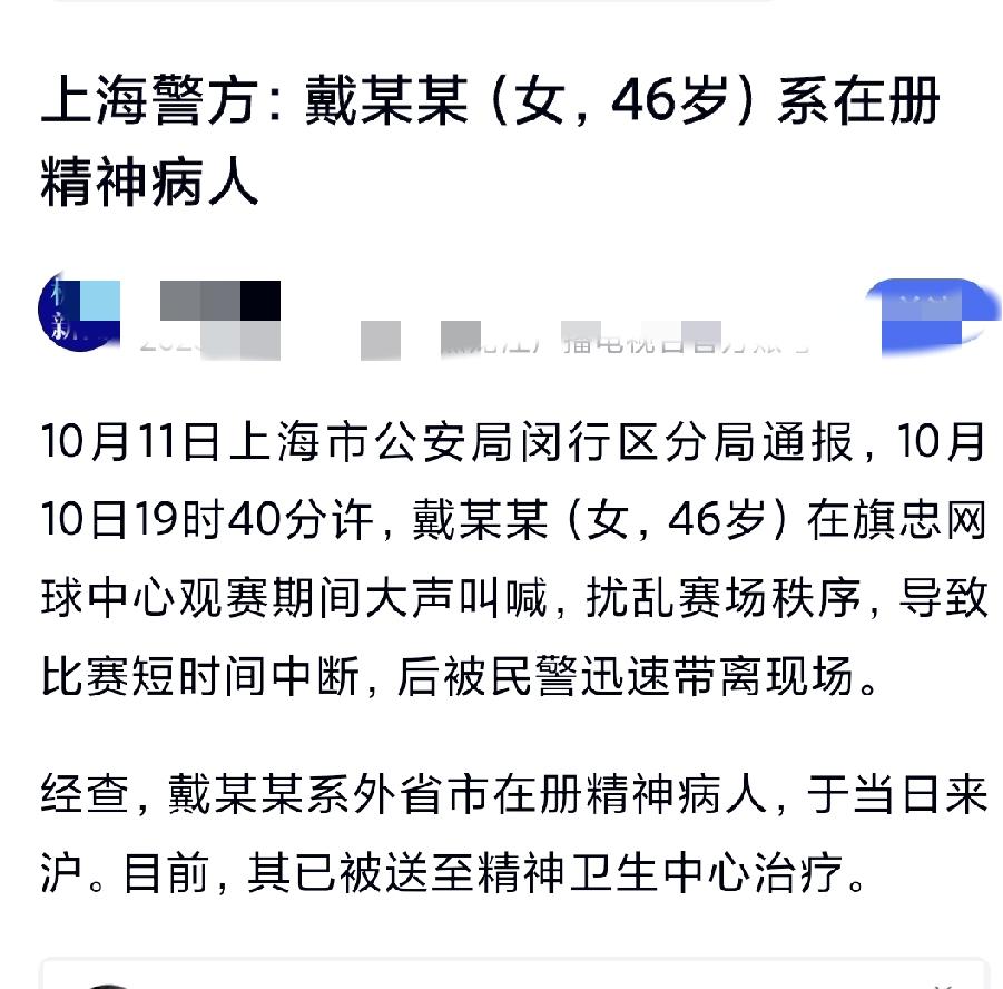 上海网球赛场昨日现精神病人再次大呼大叫! 上次只是酒后撒泼,这次直接来了个精神病人,上海网球赛场昨日又现幺蛾子! 同样短发,同样年纪(均46岁),同样戴着眼镜,同样在赛场大喊大叫,这次直接辱骂国人“东亚病夫”,不同的是,这次该女士被请出场过程比较文明,并没有被四脚朝地抬出去,而是在工作人员监视下自行离开。 今日公安局通报称10月10日戴某某(女,46岁)在旗忠网球中心观赛期间大声叫喊,扰乱赛场秩序,导致比赛中断,后被民警带离现场。 经查,戴某某系外省市在册精神病人,于当日来沪。目前,其已被送至精神卫生中心治疗。 要没这两位女士,上海这场网球赛还没那么吸引人们的关注,难怪有网友戏言“这会不会是主办方的另类宣传”? 真是一波未平,一波又起,更让人好奇:会不会还有第3个来闹事的?