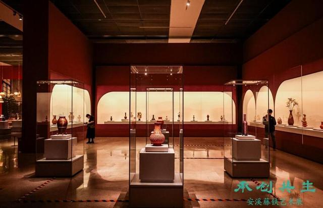 中国工艺美术馆展厅内灯光璀璨,安溪161件藤铁艺术作品在灯光的映衬下熠熠生辉。