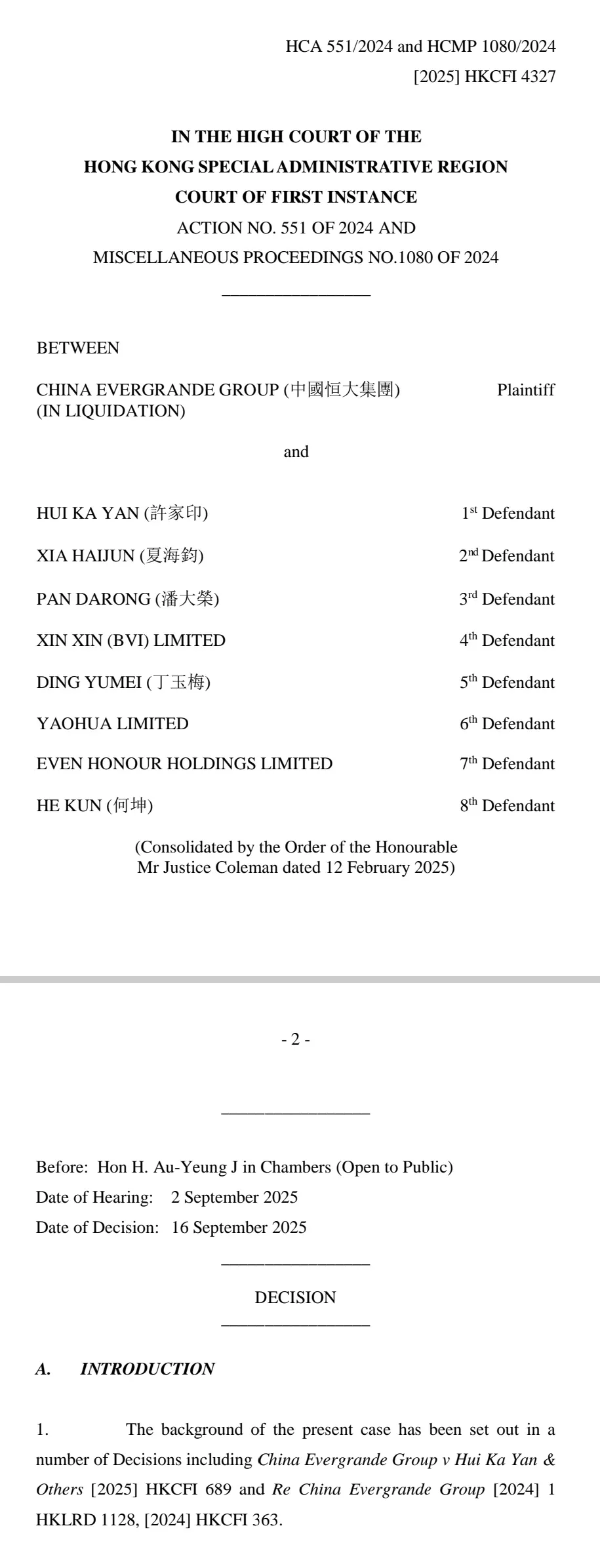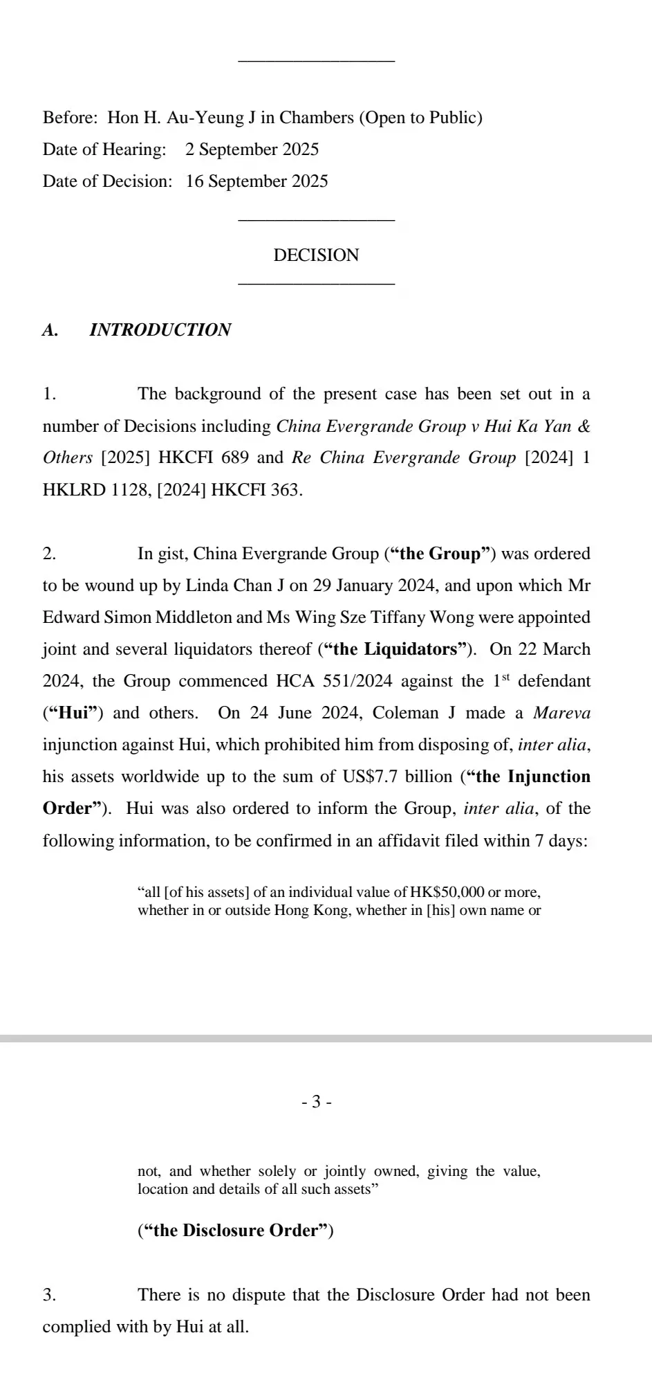 此外,根据裁决书内容,许家印根本没有遵守披露令。一方面,他没有按照要求说明相关公司与信托架构的关联,另一方面,他也没有披露相关资产的实际控制情况与流向。正因为此,恒大在今年4月发出“接管人传票”,申请任命清算人为许家印资产的接管人,香港最高法院最终支持了这一申请。