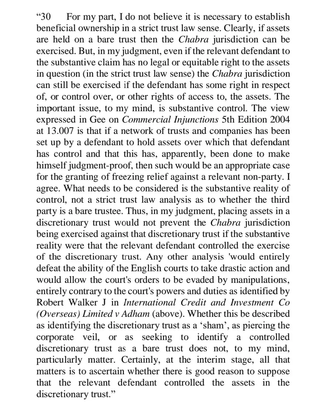 在判决书中,香港高等法院法官也提到:“若资产仅以消极信托形式持有,则可行使查布拉管辖权(theChabrajurisdiction,一种资产冻结令)。但依我之见,即便涉事被告在严格信托法意义上对相关资产不享有法定或衡平法上的权利,只要其对该资产具有某种控制权、支配权或其他接触权,仍可行使查布拉管辖权,关键在于实际控制权的实质存在。”