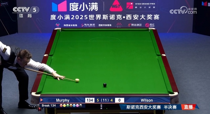 直播吧10月12日讯2025斯诺克西安大奖赛半决赛,肖恩-墨菲打出三杆破百(131、140、141)和两杆50+(91、81),加里-威尔逊打出一杆破百(139)和两杆50+(81、74)。