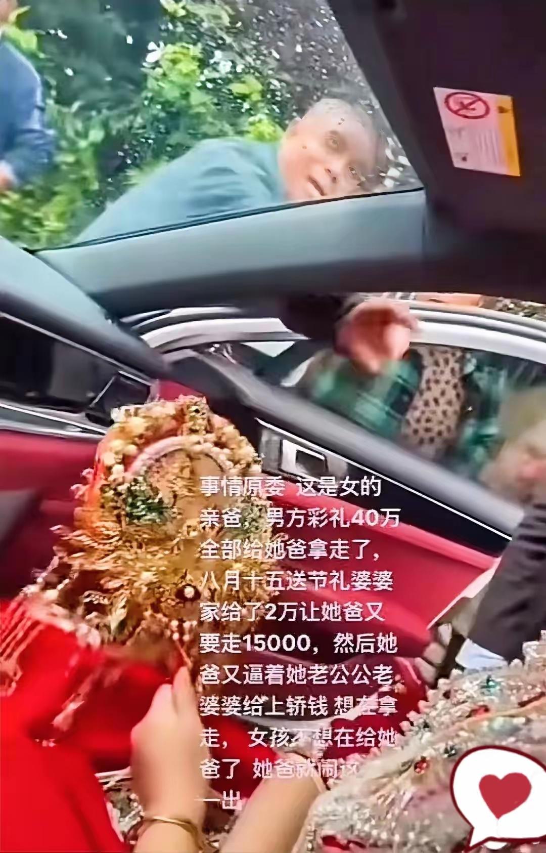 “太太太无语了!”不是别人拦婚车,是新娘亲爹,女儿不愿给钱的情况下,亲爹车头一站,放狠话:“不给钱,就不认你这个女儿!” 男方家给的40万彩礼和婆家送中秋节礼2万,就给女儿5千,这亲爹的神操作,是打算让闺女结不成婚? 好不容易婚礼这天,不被别人拦车,他老人家亲自上阵,非逼未来亲家给钱。 这爹不认也罢了!