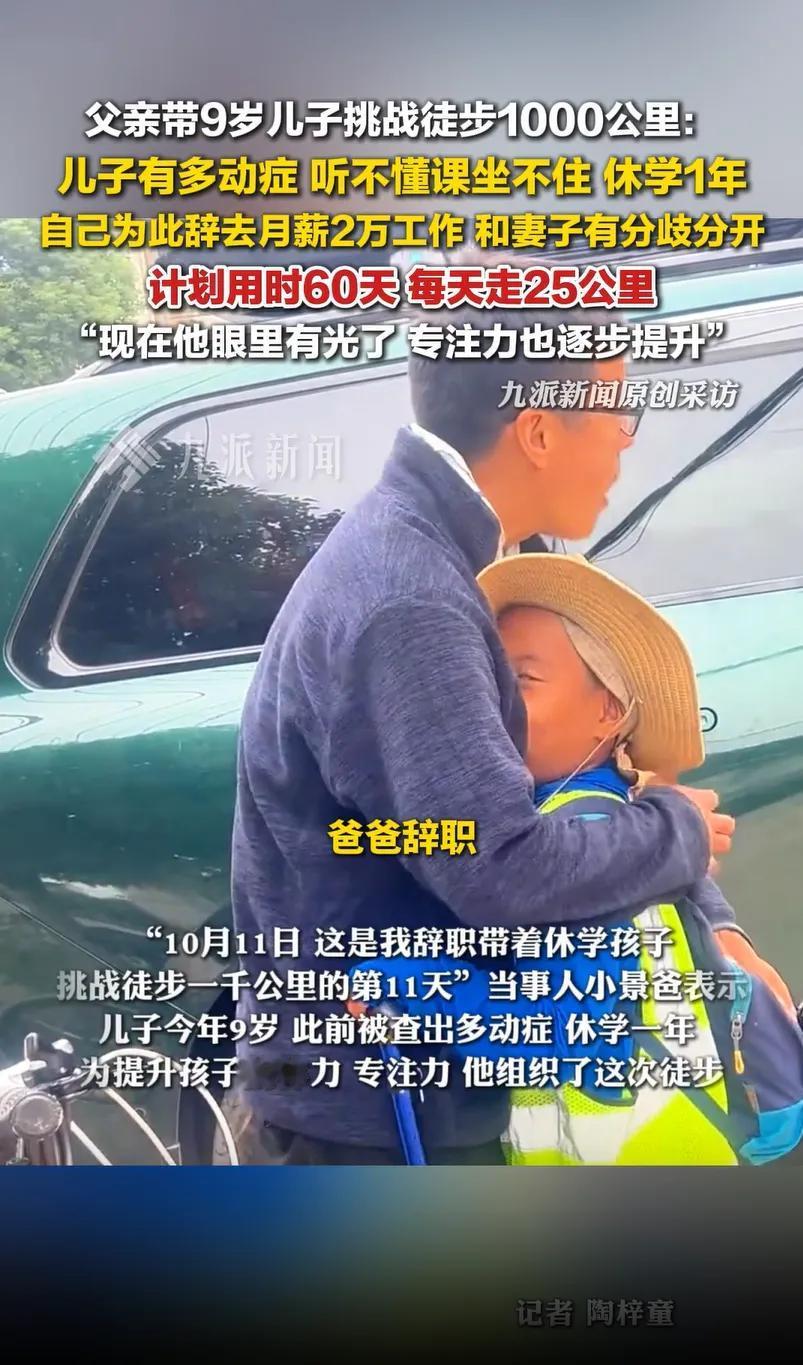 “可怜天下父母心!”父亲辞掉2万月薪工作,带9岁多动症儿子徒步1千公里,妻子不理解选择分开,带孩子徒步的第11天,父亲:孩子眼里有光了,专注力提高了。 这位父亲是伟大的,他的儿子今年9岁,此前被查出患有多动症,孩子在学校:听不懂老师讲的课,坐不住,还扰乱课堂,让老师和其他学生都无法安心教学。 这位父亲为了治疗儿子的多动症,选择让儿子休学一年,和同家庭情况的另外三家一起:带孩子徒步1千公里,用时60天,一天需要徒步25公里。 每天8点开始徒步,晚上七点结束休息。当然,孩子走累了,就中途休息。 这位父亲说,徒步11天,孩子眼里有光了,专注力也得到一定提升。 这事被报道到网上,有网友说:孩子不学习了?孩子的身体能受得住?是不是用孩子博流量? 换一种角度看,这位父亲愿意为了孩子辞掉月薪2万的工作,必定是想治疗好孩子的。 孩子都在学校学不进,好打扰到别人了,休学一年,又有何不可呢! 持续关注下去,可证明这位是为了孩子,还是为了流量,时间会是最好的证明。 祝愿,这群特殊的孩子早日康复,过上正常人的生活。 儿童多动症
