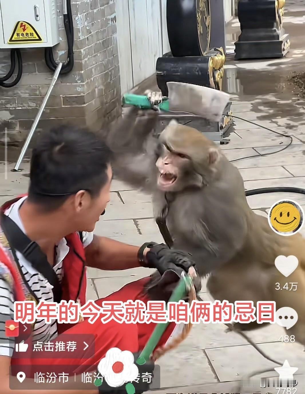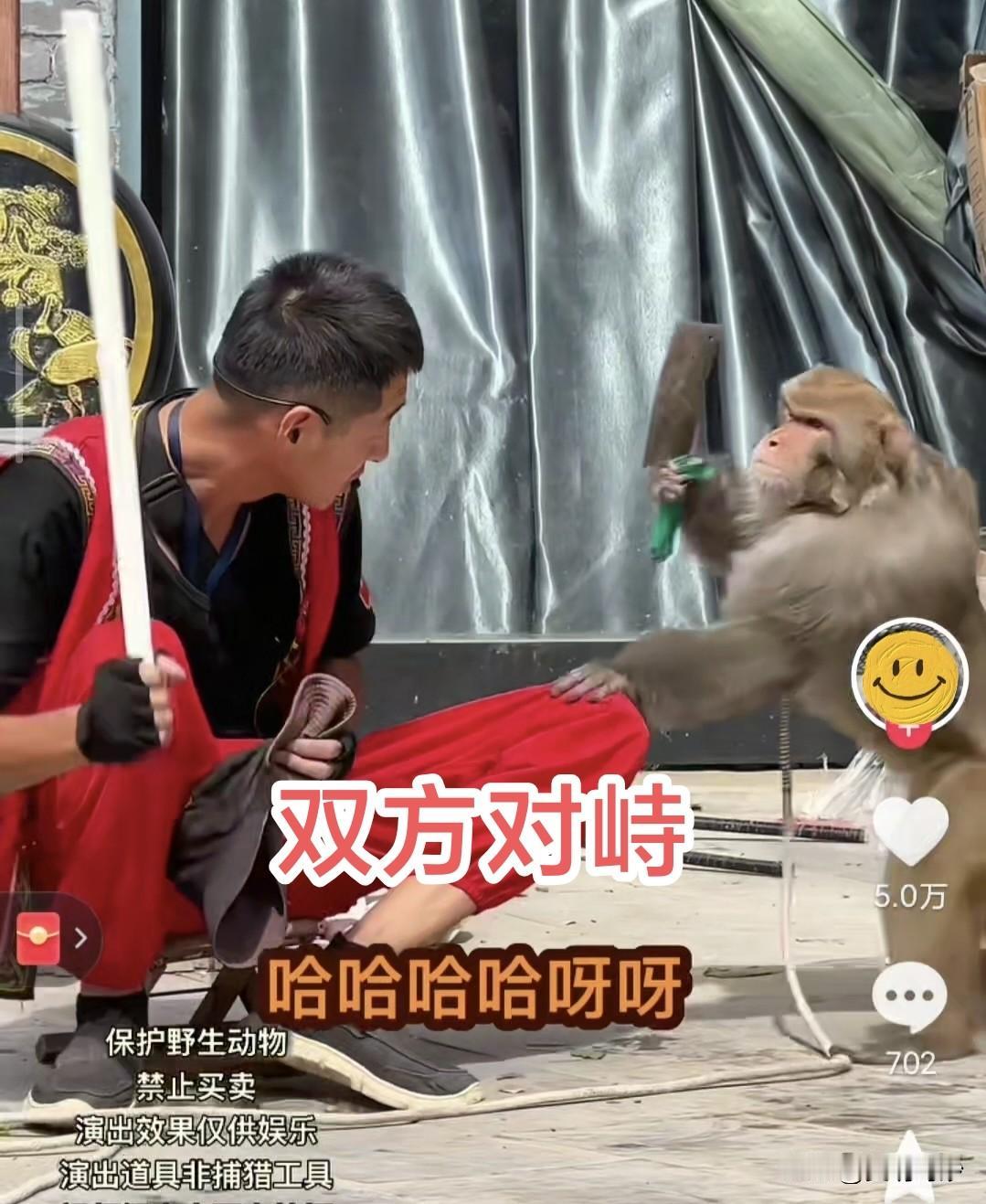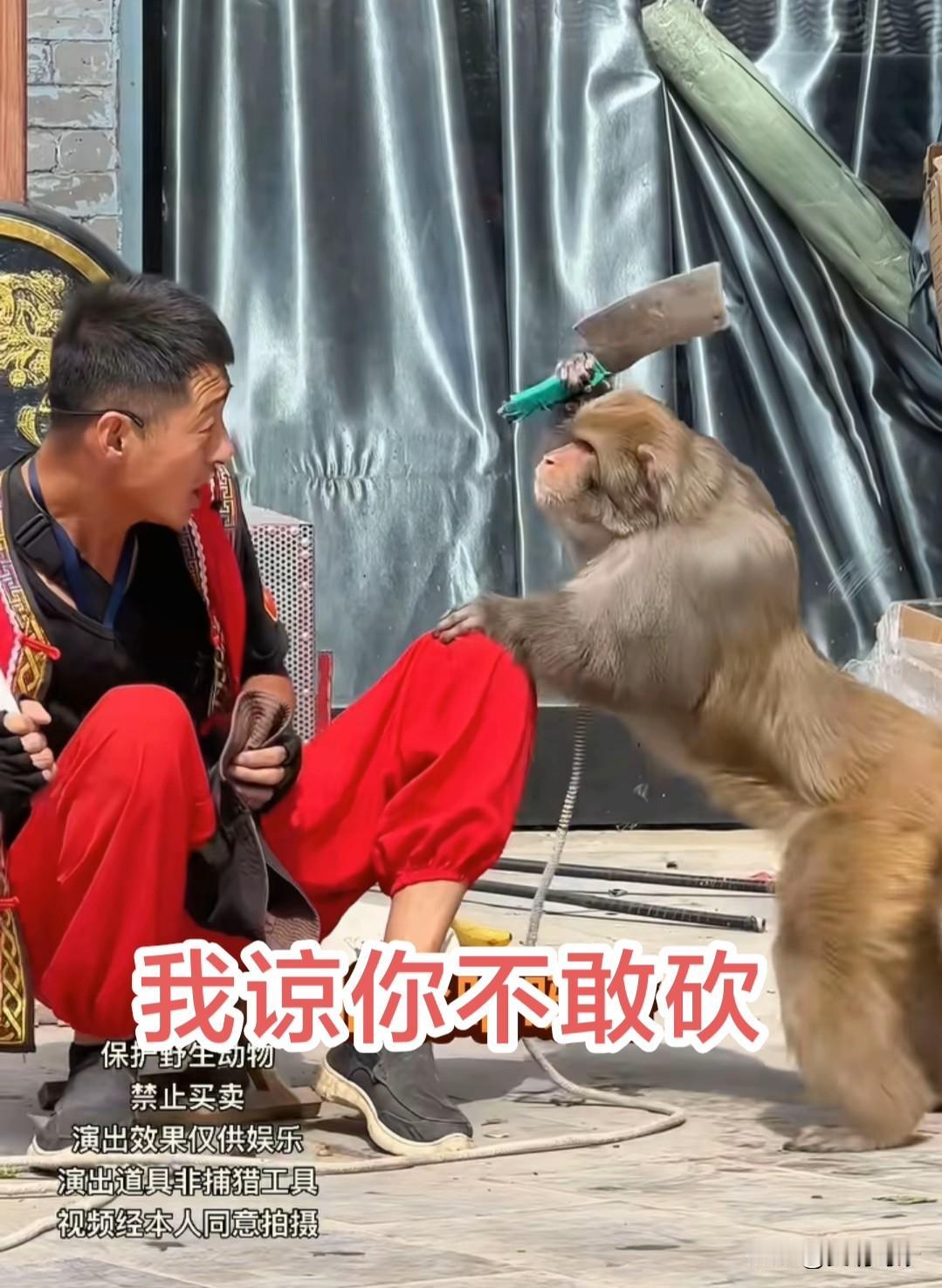 街头出现惊险一幕,一只猴子挥刀砍向耍猴人!众人惊呼! 在一场街头的猴戏中,不知为何,可能是猴子不听话,耍猴人打向猴头,猴子不甘示弱,反过来打向耍猴人,耍猴人提棍准备打猴子,岂料惊险一幕来临,猴子不知从哪来举起一把砍刀,砍向耍猴人。 当然结果有惊无险,不知这是否是早已设计好的戏码?那这猴子的演技真太好了!也有人质疑这样是否违反动物保护法。 据传,这还是非遗技艺之一,若真是这样,那不得不说,能把猴子训练成有这样的演技,真是不得了!