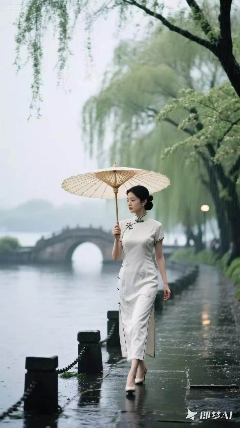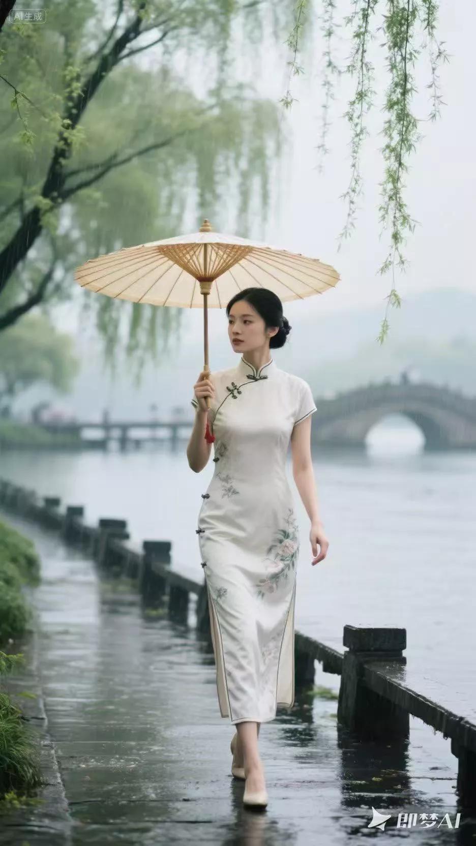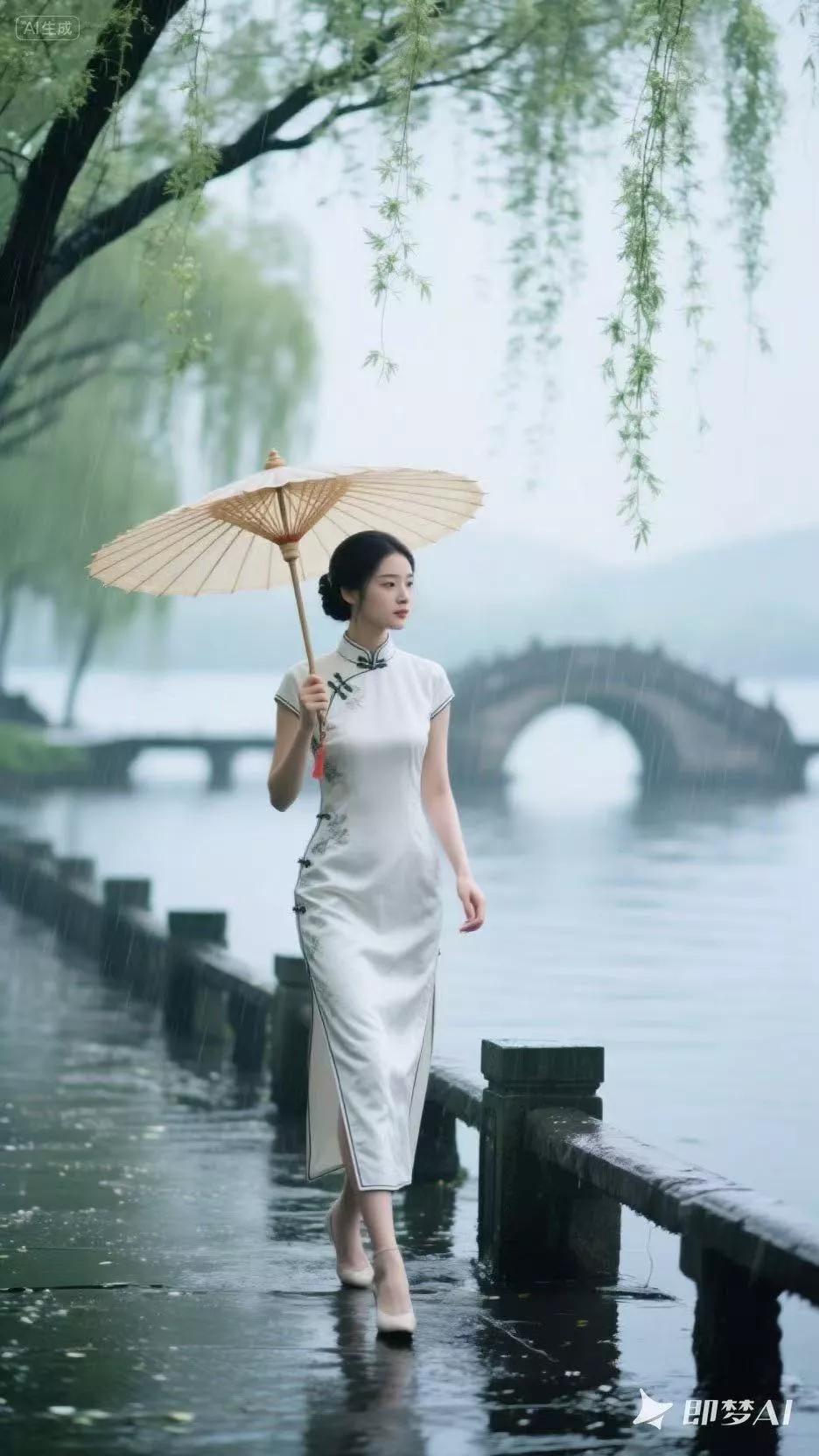西湖桥边散步的旗袍美女.江南旗袍美女 荷池旗袍美女 西湖畔美女
