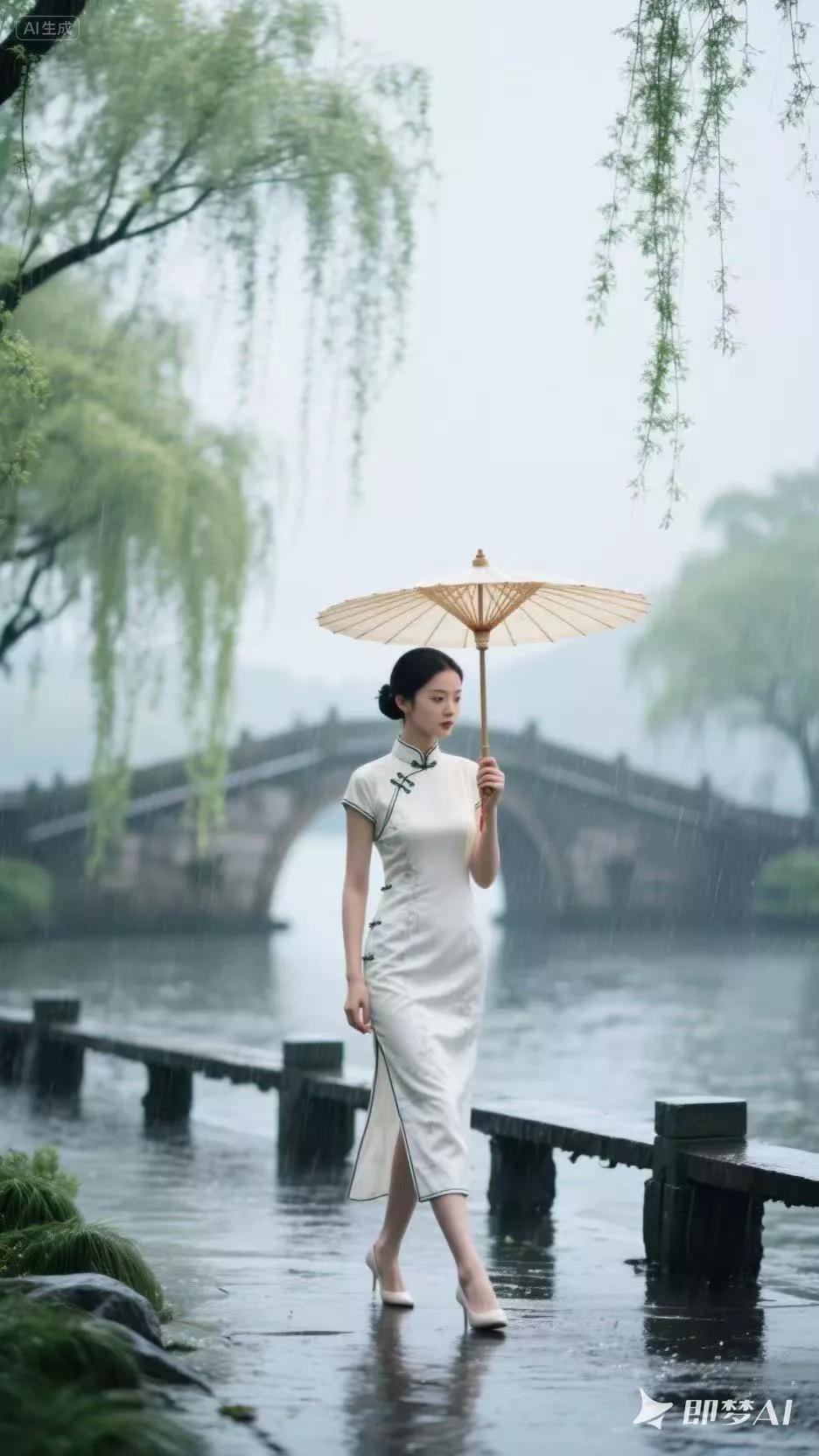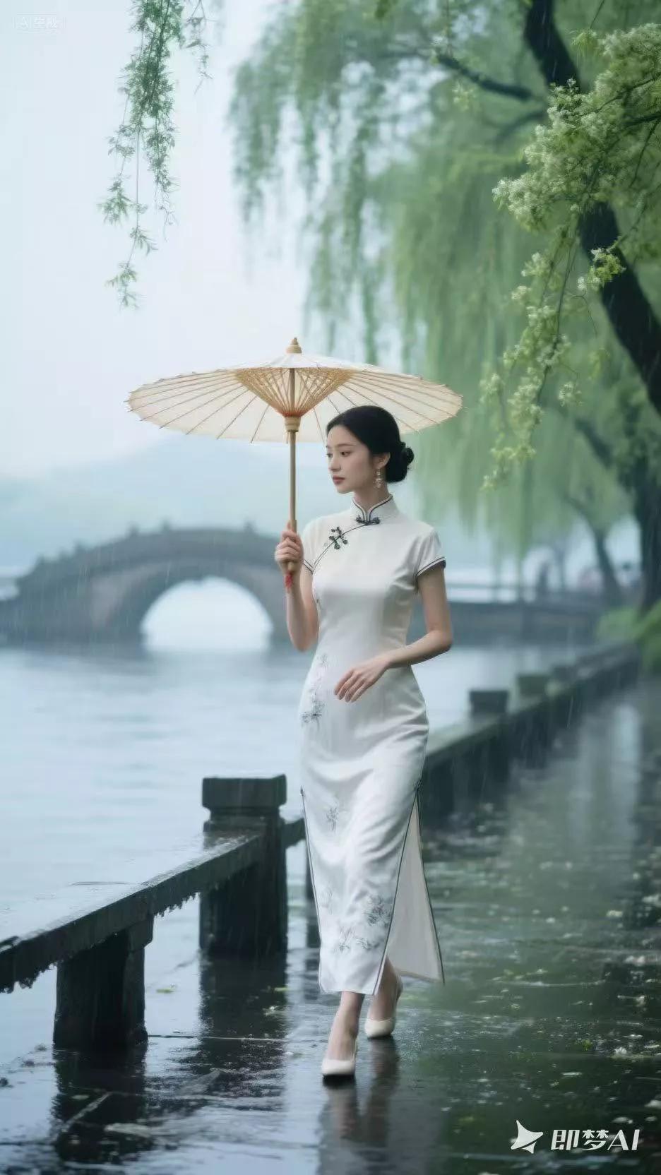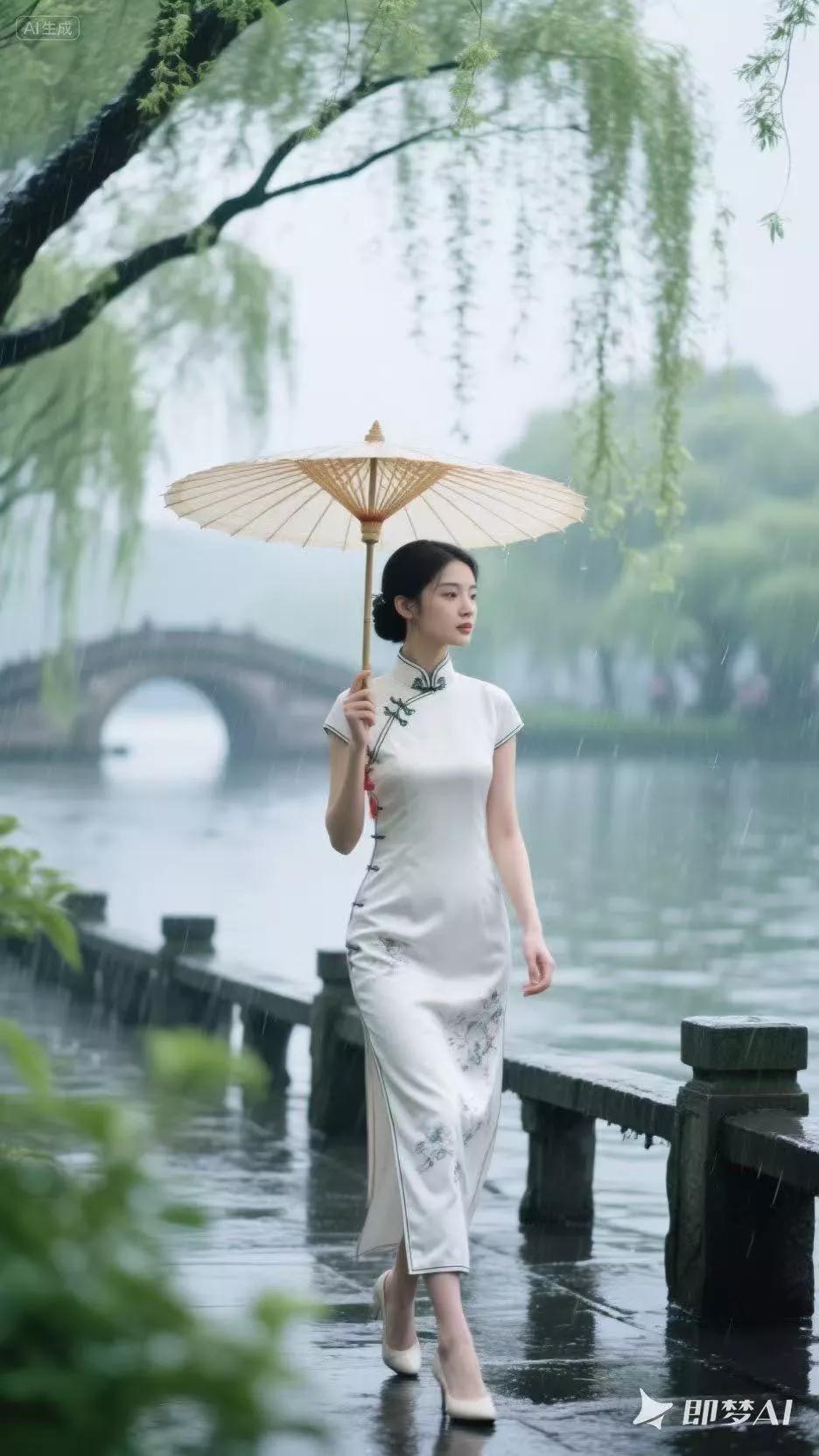 西湖桥边散步的旗袍美女.江南旗袍美女 荷池旗袍美女 西湖畔美女