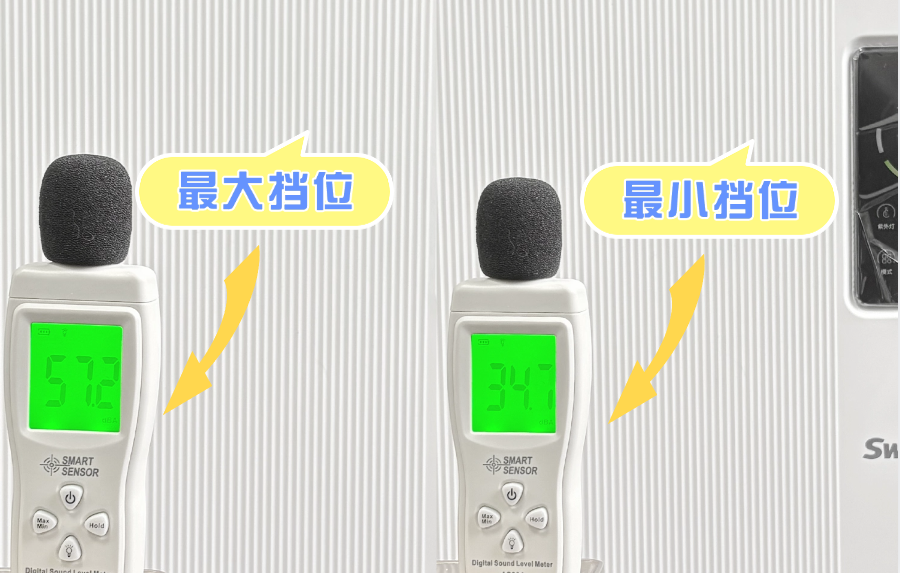 在除烟效率之外,运行时的噪音表现也很关键。特别是夜间或长期运行的场景,噪音过大会影响休息或工作,所以这部分主要想看拾梧FW01在不同风速下的噪音控制水平。将拾梧FW01分别调到最大挡位和最小挡位,看最后的净化效果如何。