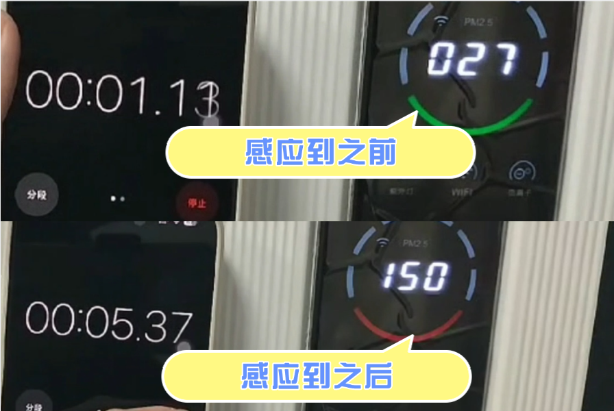 从手机秒表记录的情况来看,拾梧FW01还没有识别到烟雾,显示屏上的灯环颜色都还是绿色的,但是在5秒多就识别到了二手烟,此时的灯环颜色已经转成红色的了,然后拾梧FW01就开始自动调整风速挡位净化二手烟了。