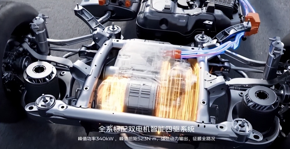 动力形式上,新车全系标配智能双电机四驱系统,系统峰值功率 340kW、峰值扭矩 523N·m。在 30 万级价格带,把高性能四驱从「顶配专属」下放为「全系标配」,意图很明确,用冗余的动力与抓地力,确保城市穿梭与雨雪湿滑路面都有更从容的底气。