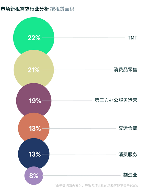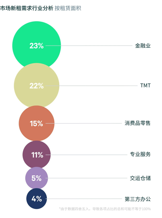 从行业需求来看,金融业连续三个季度领跑市场,占比达23%,主要受到保险和基金公司的需求推动;TMT上升至第二位,占比22%,增长动力源于人工智能以及数字解决方案类企业的旺盛需求;消费品零售业位列第三,占比15%,快消及时尚品牌的扩张成为其主要驱动力;专业服务业排名第四,占比11%,主要受益于法律和咨询公司的搬迁扩张需求;值得关注的是,交运仓储行业本季度跻身前五,占比达5%,这一变化释放出物流、电商及进出口贸易持续向好的积极信号。