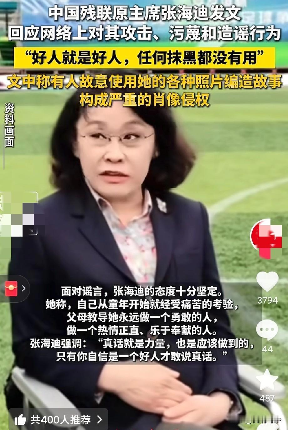 中国残联原主席张海迪近日发文,强硬回应网络上的攻击、污蔑与造谣。有人恶意使用她的工作照、生活照编造故事,构成严重肖像侵权,造谣程度“达到了极限”。 面对污蔑,张海迪态度坚定。她自童年起便经受绝症的痛苦考验,她坚信“真话就是力量”,始终为工作尽心竭力,不做不该做的事,这份坦荡与坚守,让她无惧任何诋毁,正如她所言:“好人就是好人,任何抹黑都没有用”。