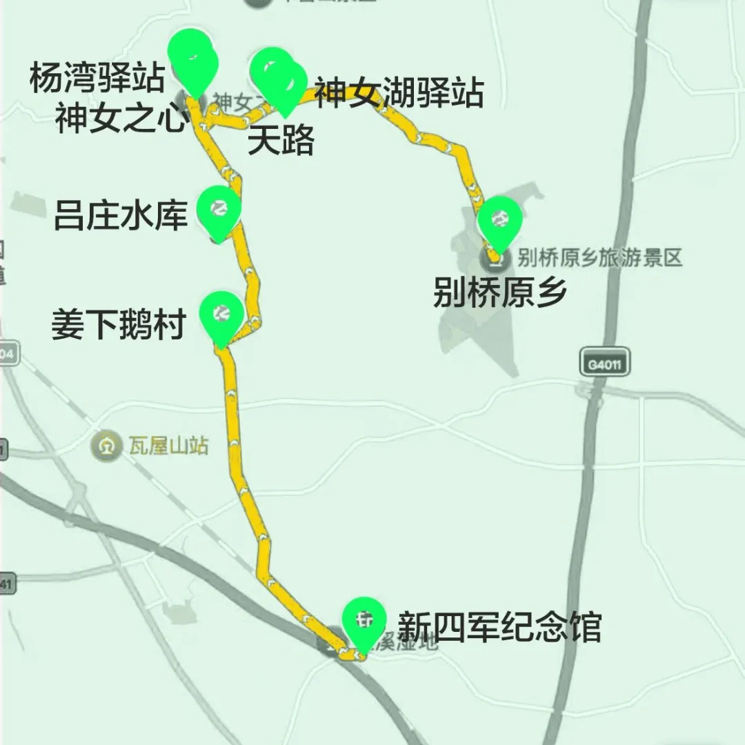 新四军纪念馆-姜下鹅村-吕庄水库-神女之心-杨湾驿站-最美天路-神女湖驿站-别桥原乡