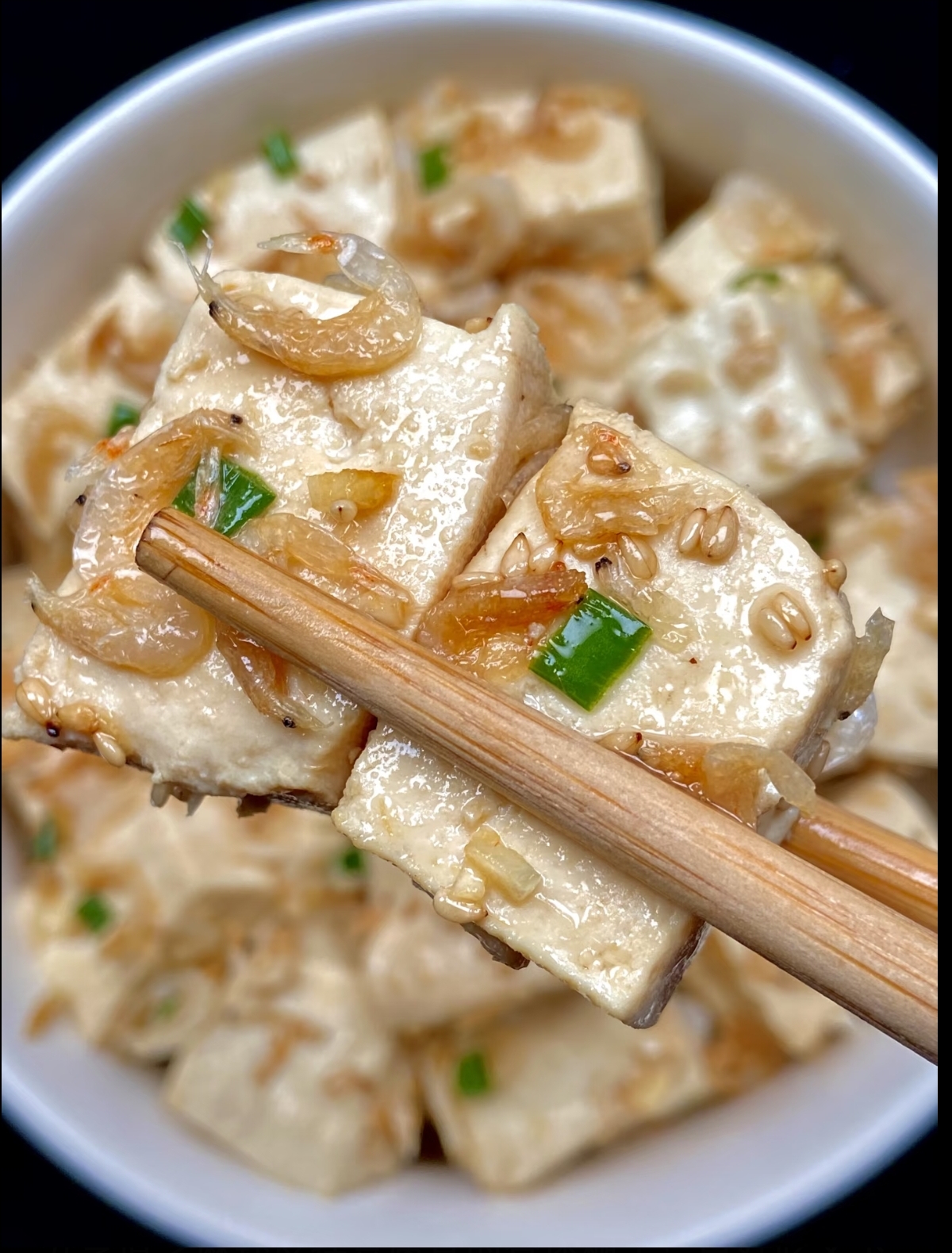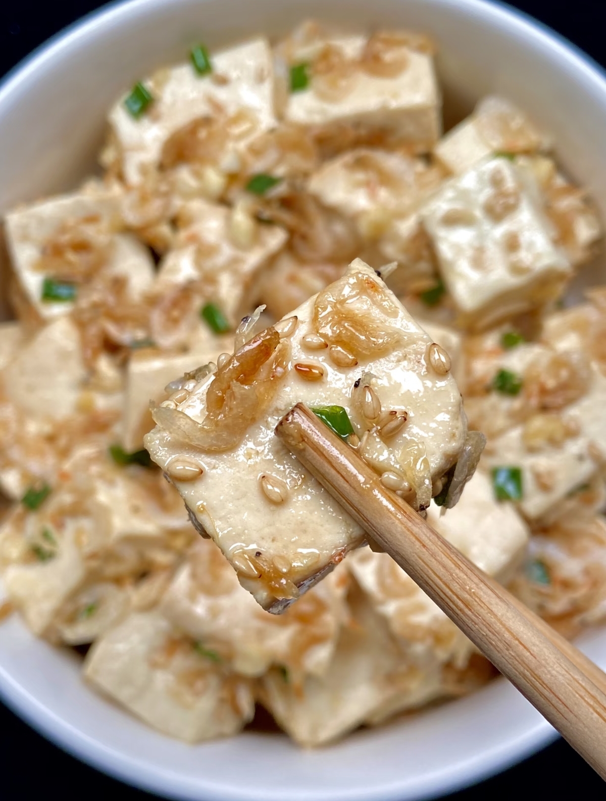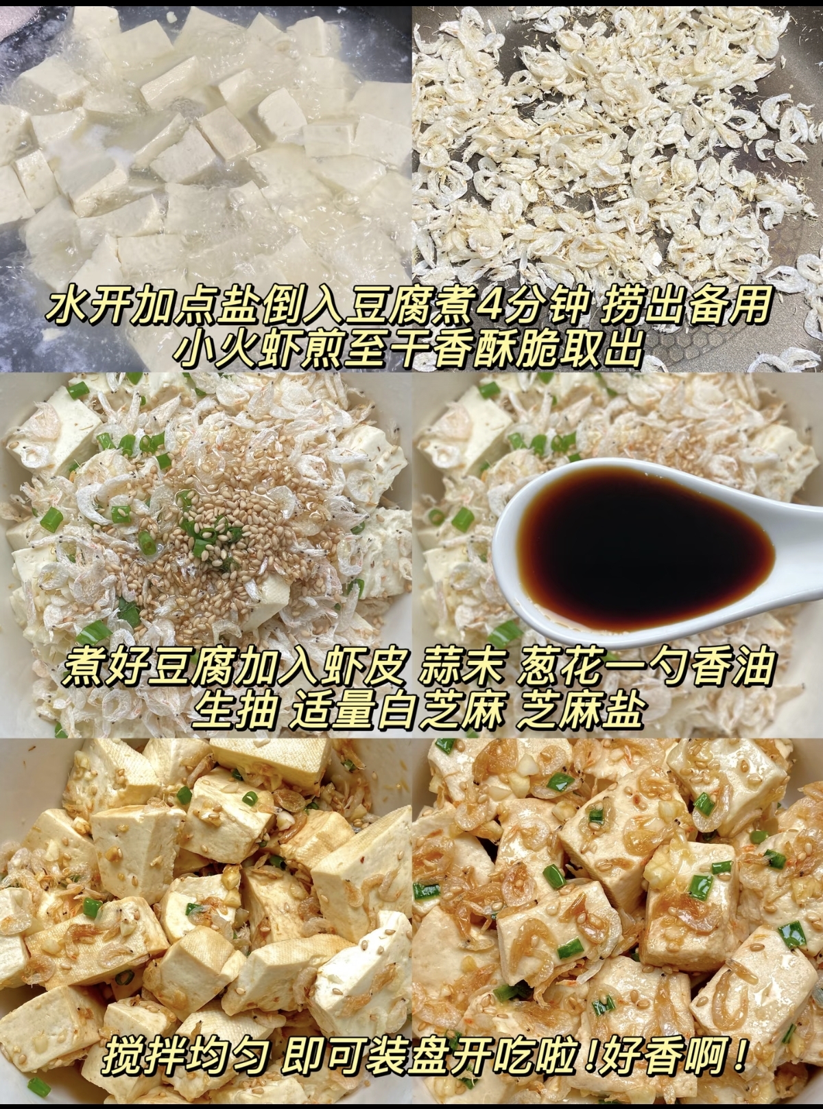 盛一碗刚出锅的白米饭,舀一勺拌好的豆腐盖在饭上,米饭的温热与豆腐的微凉交织,嫩滑的豆腐在舌尖化开,虾皮的脆香、芝麻的醇厚、葱蒜的辛辣与酱汁的鲜美在口腔中奏响一曲和谐的交响乐。这道看似简单的家常菜,实则蕴含着对食材的尊重与对生活的热爱。它不需繁复的技巧,却能以最质朴的方式,抚慰每一个疲惫的胃与灵魂。