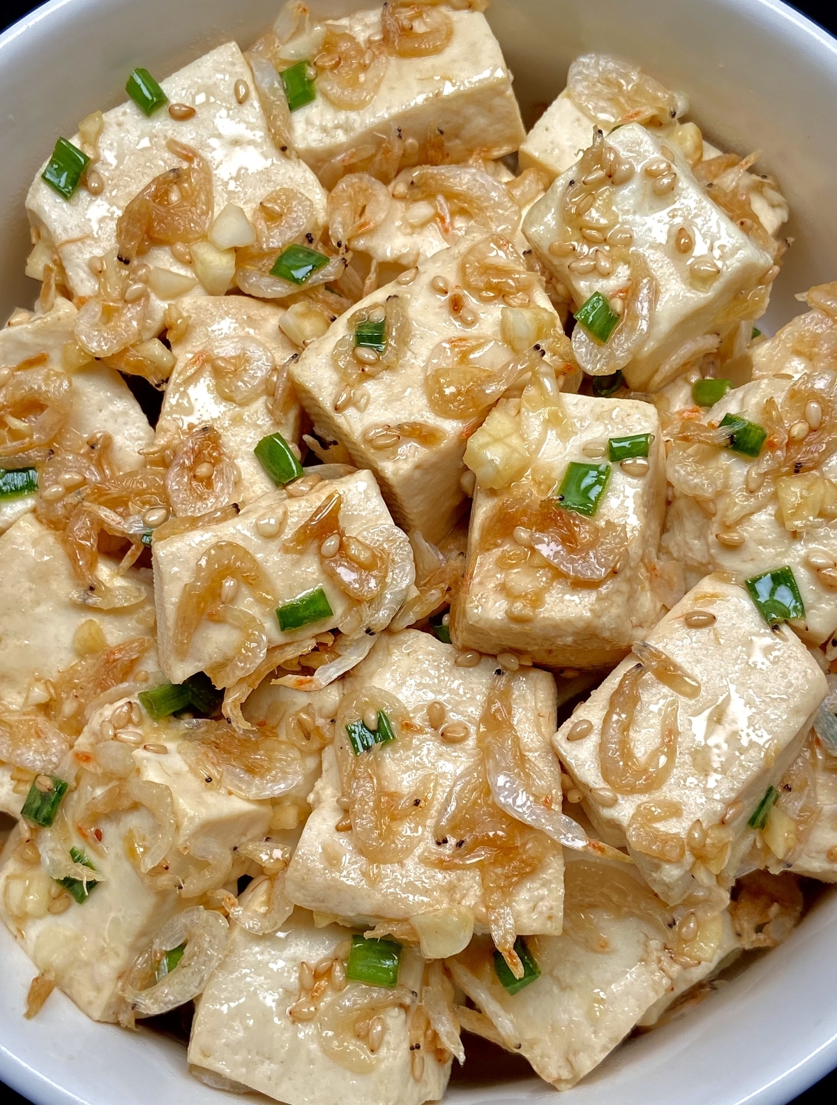 紧接着,将炒香的虾皮、熟芝麻、葱花和蒜末一并撒在豆腐上。此时,若想让风味更上一层楼,可以烧一勺热油,待油微微冒烟时,迅速淋在葱蒜和芝麻上。“滋啦”一声,葱蒜的辛香与芝麻的醇香瞬间被激发,弥漫整个厨房,令人食指大动。最后,用勺子轻轻拌匀,让每一粒芝麻、每一片虾皮都与豆腐亲密接触,每一滴酱汁都渗透进豆腐的缝隙。