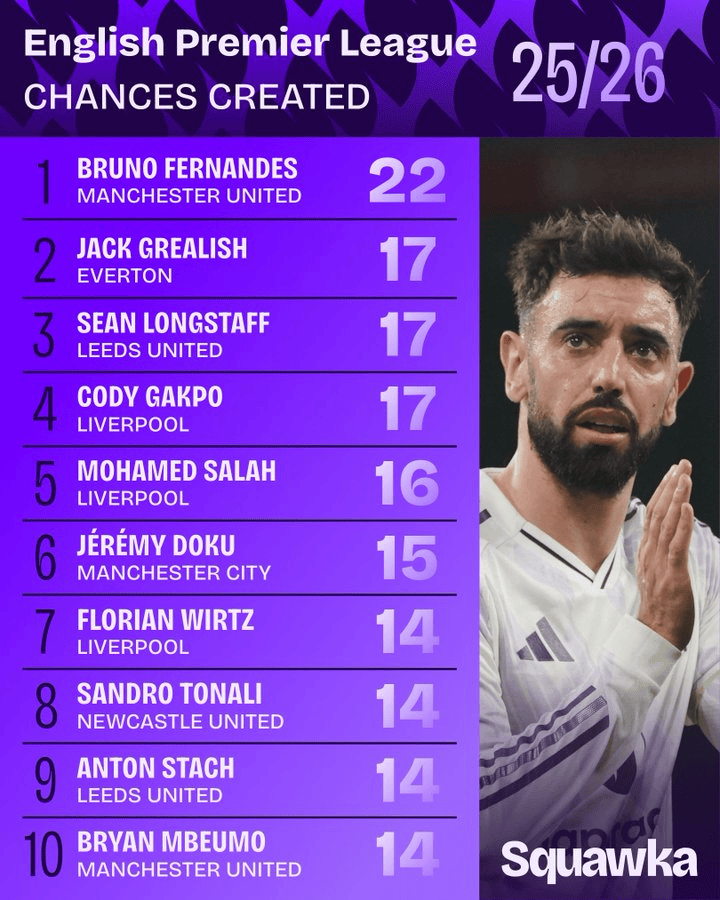 虎扑10月21日讯Squawka盘点了本赛季至今英超创造机会榜,曼联中场B费创造了22次得分机会,稳居联赛第一,也是唯一一位突破20次的球员。埃弗顿的格拉利什、利兹联的朗斯塔夫和利物浦的加克波以17次并列第二;利物浦的萨拉赫排名第五(16次)。