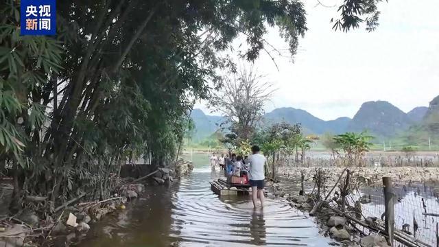 由于积水还没有完全消退,为了方便在市区上学的孩子们,村里为村民自制了木筏船。