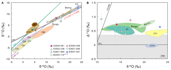 CI型陨石的母体小行星主要分布在外太阳系,具有富水与有机质等挥发性成分特征。进一步统计表明,此类陨石在月球表面的比例远高于地球,说明碳质陨石对地月系统的撞击贡献可能被严重低估。该研究不仅表明小行星带物质可以向内太阳系迁移,还对解释月球表面水的来源具有重要意义。研究人员提出,此前在月球样品中检测到的具正氧同位素特征的水,很可能来自这类陨石的撞击贡献。