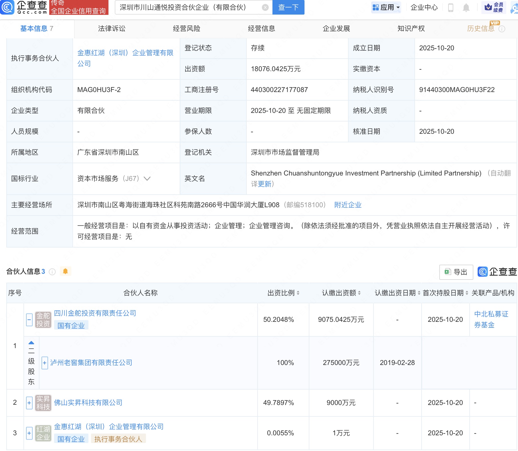 企查查APP显示,近日,深圳市川山通悦投资合伙企业(有限合伙)成立,经营范围包含:以自有资金从事投资活动;企业管理;企业管理咨询。企查查股权穿透显示,该企业由泸州老窖集团有限责任公司全资子公司四川金舵投资有限责任公司等共同出资。