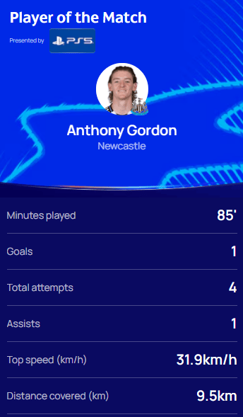 传射建功,安东尼-戈登当选纽卡3-0本菲卡全场最佳球员