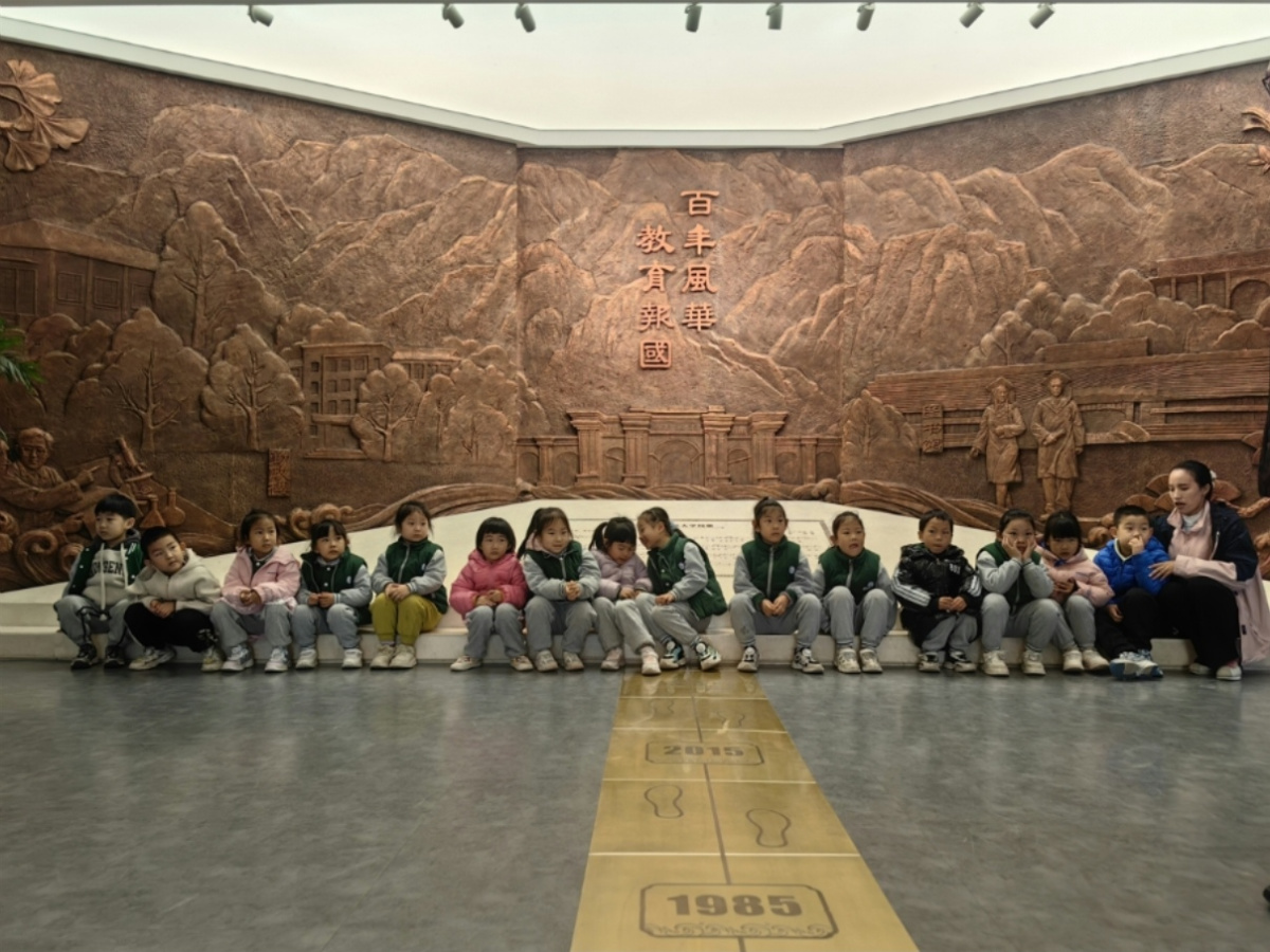 “踩脚印啦!我们要回到学校‘小时候’啦!”随着一声欢呼,“时光穿越”环节拉开序幕。萌娃们牵着小伙伴的手,踩着印有关键年份的彩色脚印一步步向前,小嘴巴里不停念叨:“1923,学校是不是这个时候出生的呀?”“1956年,它是不是换了新名字?”有孩子突然停下脚步,仰着小脸对讲解员姐姐说:“原来学校比爷爷的年龄还大!”简单的脚步与童言,让百年校史的时间线在孩子心中悄然萌芽。