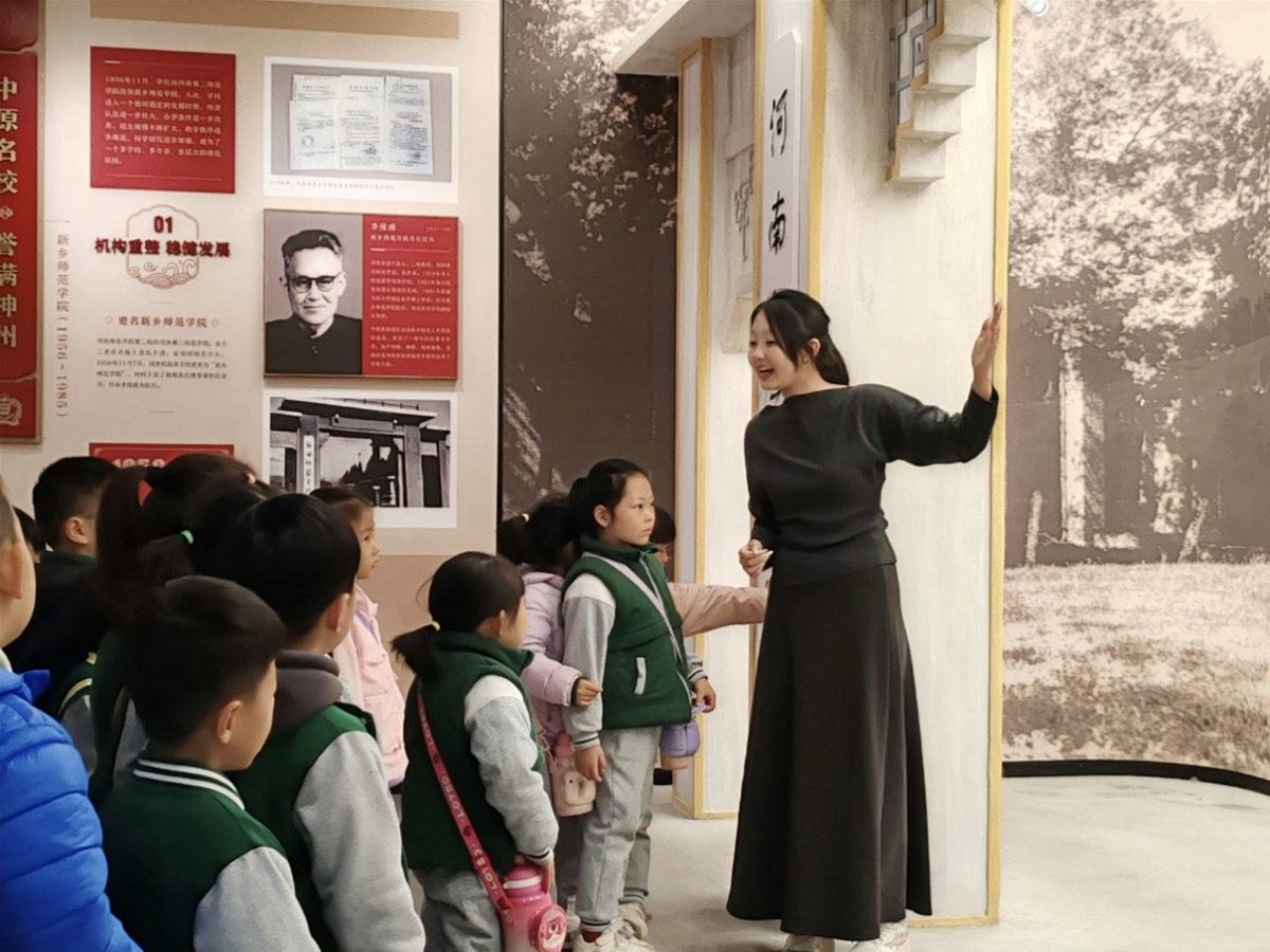 为了让抽象的“百年”变得具体、厚重的历史变得鲜活,讲解员们特意将学校发展脉络拆解为9个趣味闯关环节,每一处设计都经过“儿童视角”的反复校验:把“1923年创办”“1956年更名新乡师范学院”等关键年份印成彩色“时光脚印”;将战乱中办学的艰辛凝练成“迁徙小侦探”沙盘模型;把校徽文化融入“寻宝”游戏……这份专属设计,从萌娃们对着“时光脚印”好奇打量、在校史浮雕前专注寻找太行山与黄河图案的瞬间,便抓住了孩子们的心。“我们想让校史不是‘高高在上’的陈列,而是能‘弯下腰’和孩子对话的朋友。”讲解员司若涵笑着说。