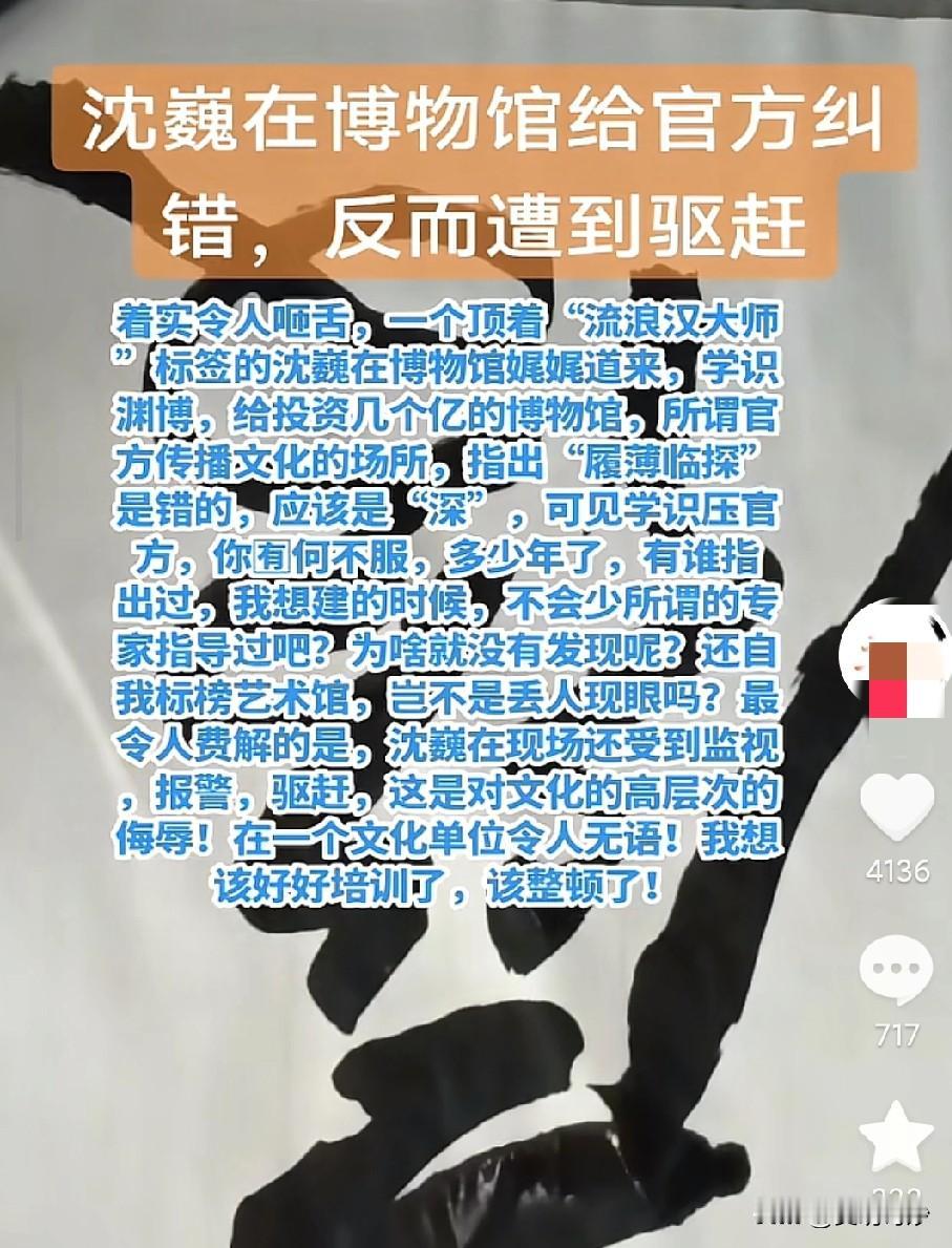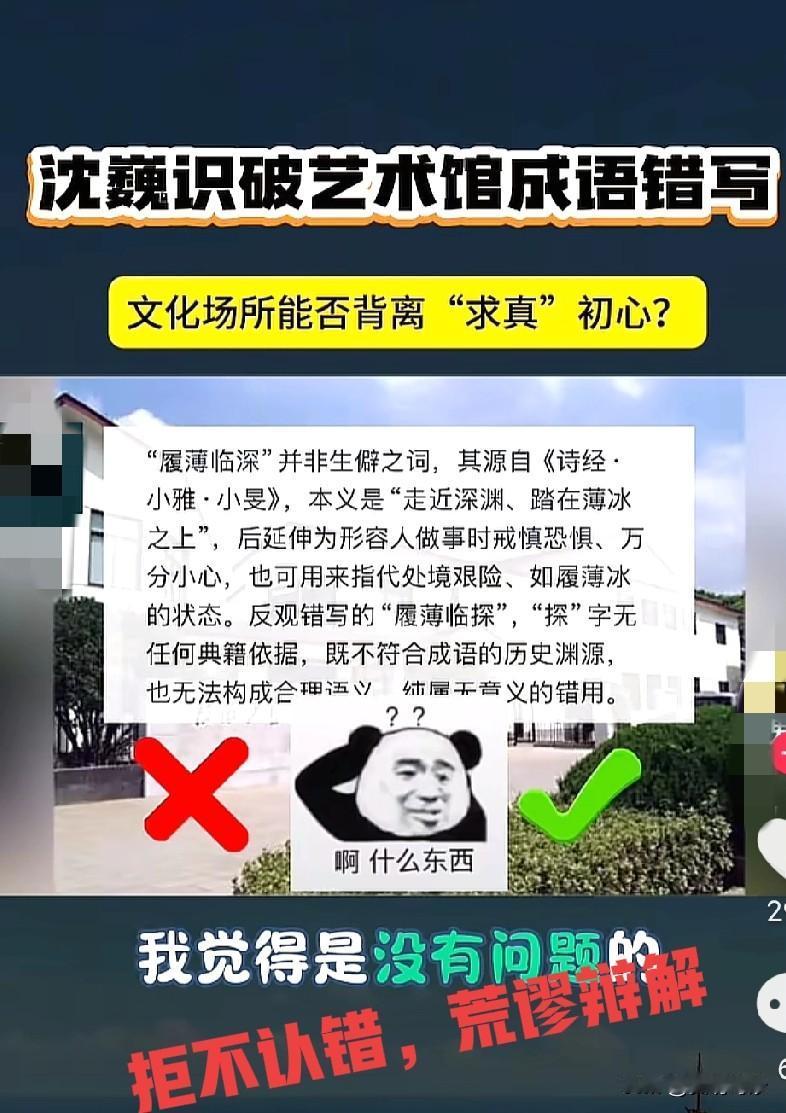 沈巍在纪念馆又遭报警驱逐,陆俨少纪念馆还死不认错沈巍指出的展馆中的明显错误。 沈巍在参观陆俨少少艺术馆时,凭借一眼识破馆内将成语“履薄临深”错写为“履薄临探”。“履薄临深”源自《诗经·小雅·小旻》,寓意行事谨慎、处境艰险,而“探”字无任何典籍与事实依据,是明显错字。 这一错误,既体现了沈巍深厚的文化素养,也暴露了该文化场所的疏漏。更令人遗憾的是,馆方面对明确错误,非但未展现文化机构应有的虚心,反而摆出拒不认错的傲慢姿态,辩解理由概念模糊、逻辑牵强。 文化场所肩负艺术传播与文化教育使命,其生命力在于真实性与严肃性。陆俨少艺术馆作为文化机构,若连求真求实的基本精神都不愿坚守,便是对自身初心的背离。特别是他对沈巍一行人来传播文化的这种如临大敌的仇视态度,令人极度反感,有问题可以协商,居然报警!警察还居然真的来了!有必要吗?