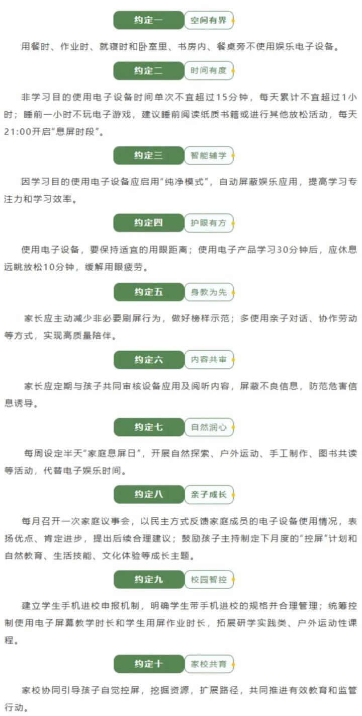 这份倡议书共有10条约定,包括用餐时、作业时、就寝时和卧室里、书房内、餐桌旁不使用娱乐电子设备;非学习目的使用电子设备时间单次不宜超过15分钟,每天累计不宜超过1小时;睡前一小时不玩电子游戏,建议睡前阅读纸质书籍或进行其他放松活动,每天21:00开启“息屏时段”等。