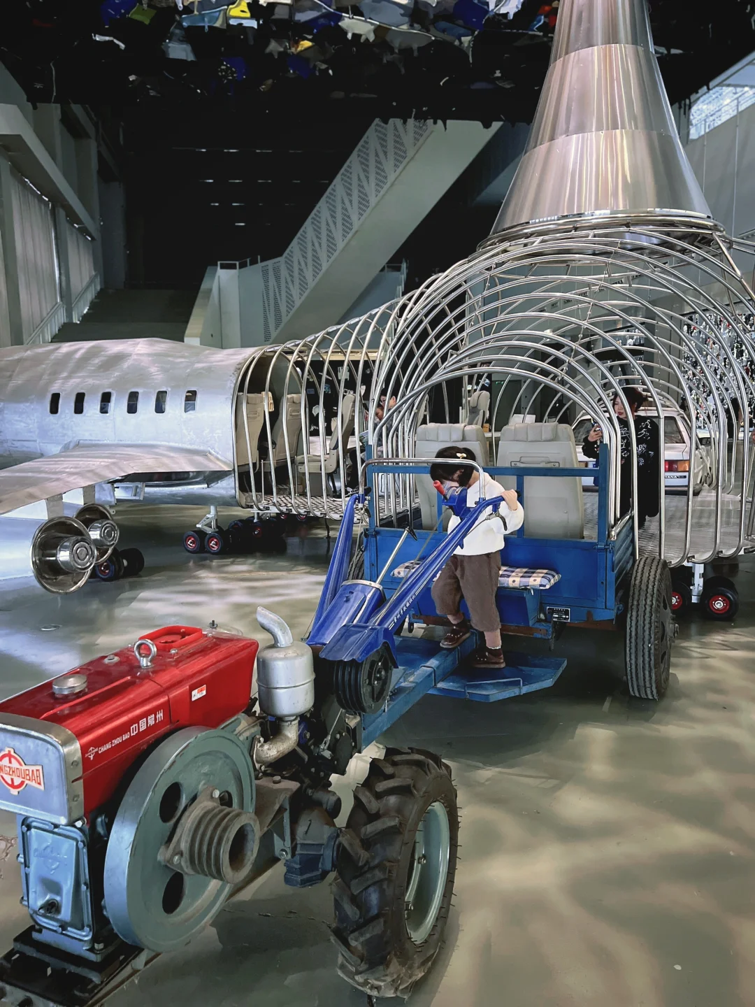 🔹大型装置艺术《飞行器》:,农用手扶拖拉机+80年代上海桑塔纳与波音747跨界对话,从速度的变化诉说时代的变迁