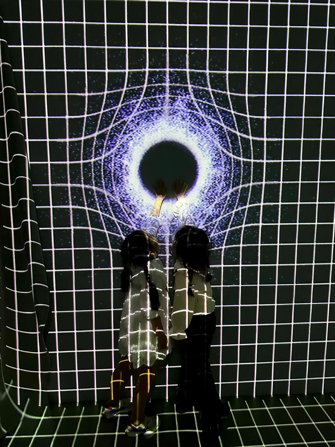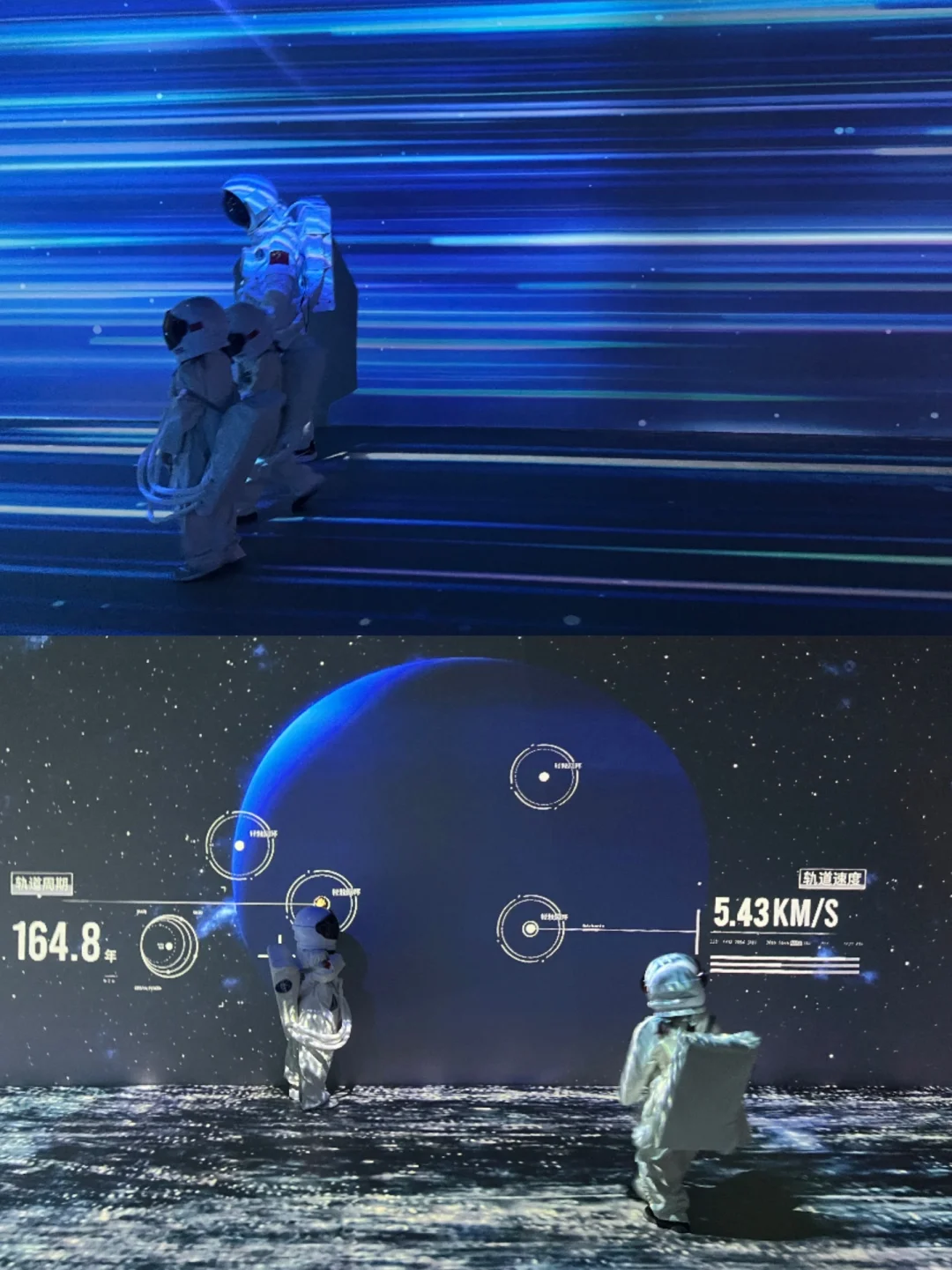 🔸 星际桥梁,全息投影的星河在身边流淌,一会儿置身时光隧道,一会儿又置身广袤无际的宇宙。每颗星球都有详细介绍,还可以点击互动,太绚丽了