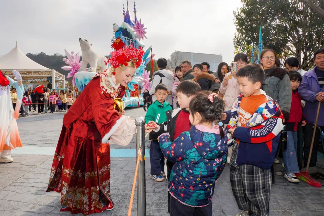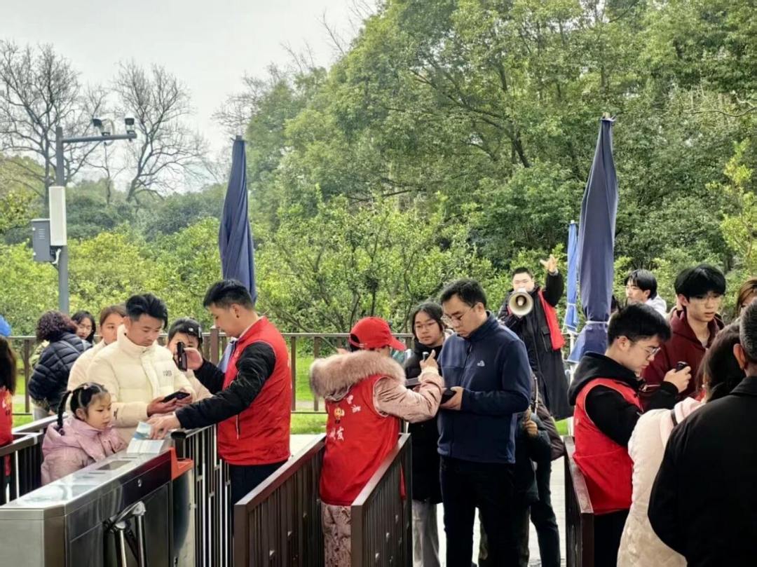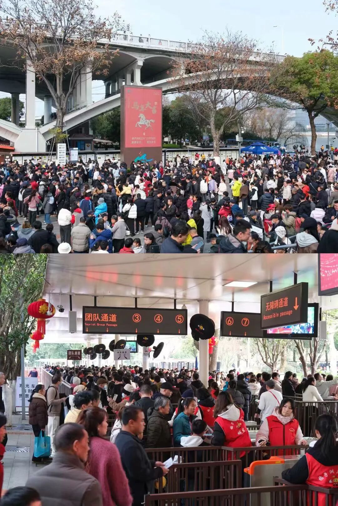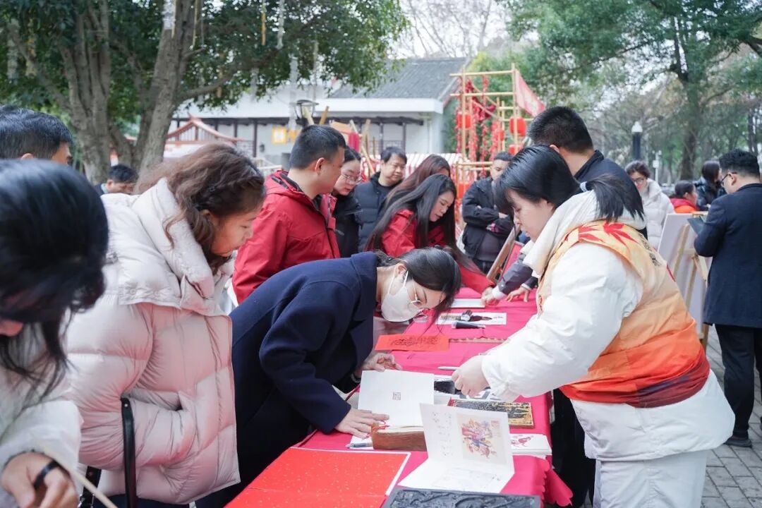 入口处,游客们排着长队领取新年红包;园内,绘制纸鸢、投壶套圈的摊位被围得水泄不通,身着宋制汉服的工作人员巡游送福,与游客合影留念。