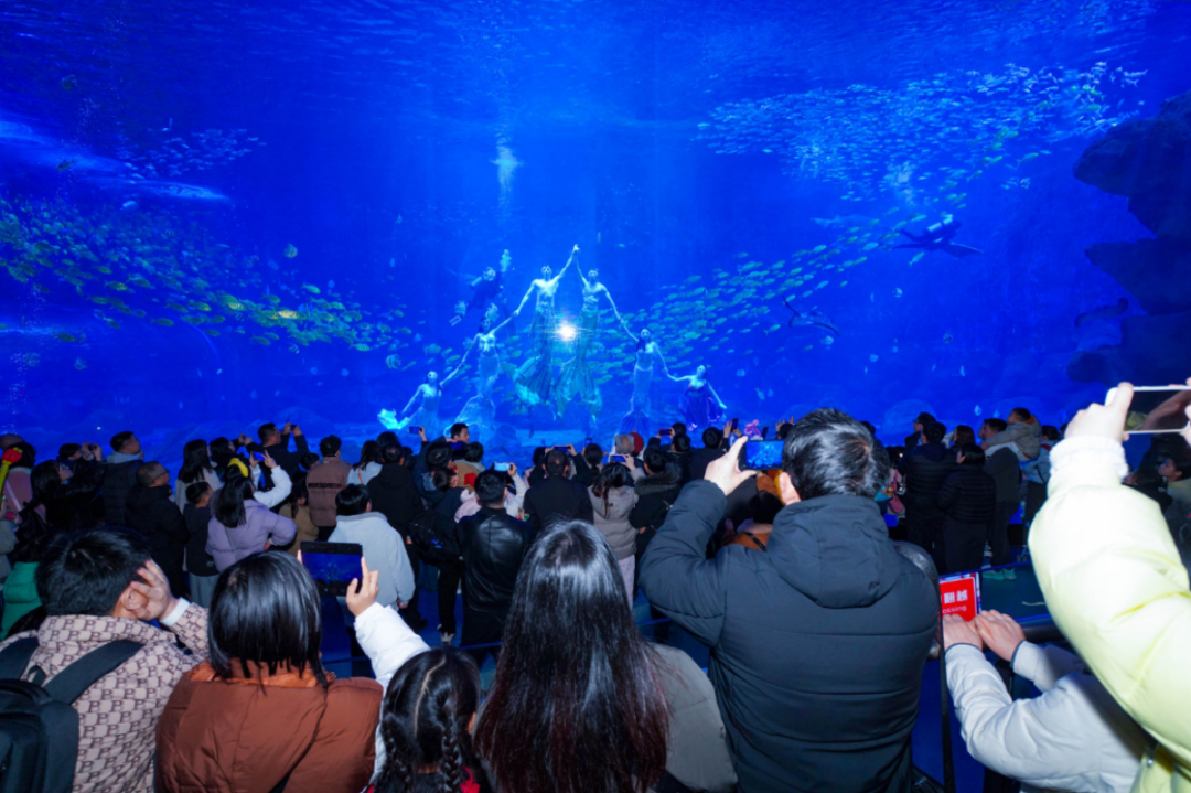 湘江海洋王国的“海洋神马节”,让游客们体验了一场“水下新春”。湖南首秀的水下舞龙大秀中,潜水员身着龙形服饰,在碧波中腾跃穿梭,与鱼儿共舞;非遗火舞表演里,打铁花的璀璨火光与火焰舞的灵动身姿,点燃了夜空;数百架无人机以天为幕,绘出“天马送福”“马到成功”的光影画卷,引得游客们阵阵惊叹。乌镇同款《小王子》演出与海洋萌宠互动,更是让亲子家庭流连忘返。