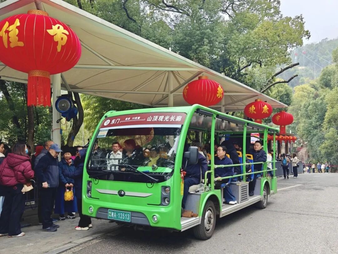 入园处,身着红马甲的志愿者正耐心地为游客讲解扫码预约流程;观光车排队区,工作人员不停引导分流,队伍虽长却移动有序。登上山顶观光长廊,湘江新区的城市新貌尽收眼底——高楼林立与绿水青山相映成趣,湘江如带,蜿蜒流淌。