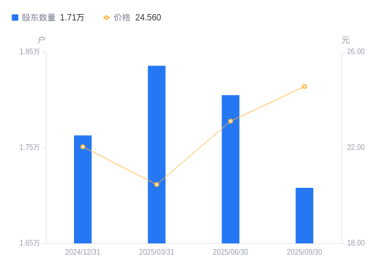 日期A股户数(户)流通A股户均持股数(股)户均持股市值(万元)2025-09-30170815427.5513.332025-06-30180505136.1811.872025-03-31183565050.5610.332024-12-31176285145.9811.342024-09-30210364312.299.722024-06-30247533630.587.922024-03-31263803406.669.132023-12-31286863109.9512.922023-09-30192634613.2510.272023-06-30203804381.0810.94