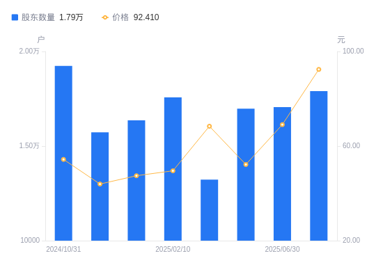 日期A股户数(户)流通A股户均持股数(股)户均持股市值(万元)2025-09-30179074046.1137.392025-06-30170604247.0029.332025-03-31169774342.4122.672025-02-20132255966.3640.802025-02-10175704490.9022.252024-12-31163574401.3620.892024-12-10157244578.5520.122024-10-31192403741.8420.342024-10-10148934834.0219.342024-09-30153504690.1019.65