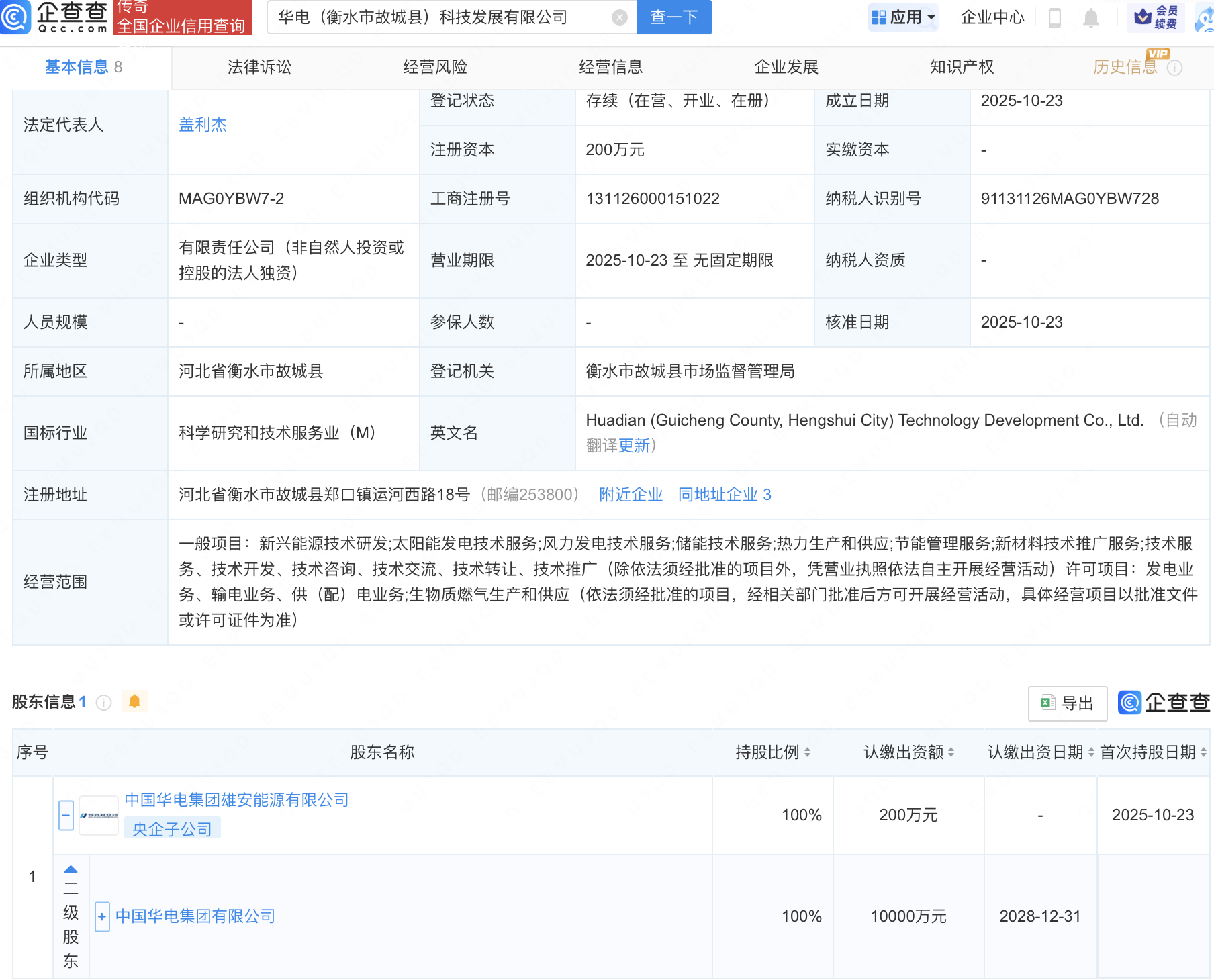 企查查APP显示,近日,华电(衡水市故城县)科技发展有限公司成立,经营范围包含:新兴能源技术研发;太阳能发电技术服务;风力发电技术服务;储能技术服务等。企查查股权穿透显示,该公司由中国华电集团有限公司间接全资持股。